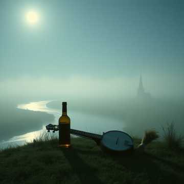 Expansive Celtic ambient soundscape with haunting tin whistle motifs, airy drones, and soft male vocals, Low, steady frame drum pulses like a distant heartbeat; washed-out pads swell under gentle fiddle phrases, Reverbs stretch into the hills, letting phrases linger, Final chorus floats over a wordless choral pad, then dissolves into wind and river sounds, ambient
