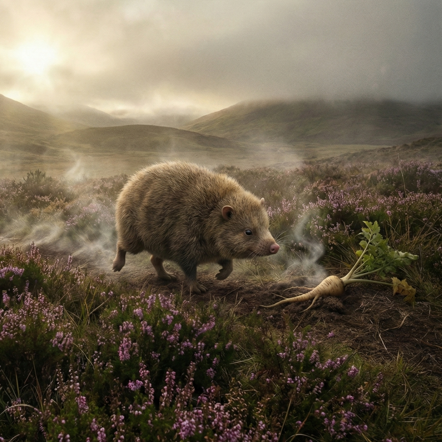 Is the Haggis chasing the parsnip, or is he chasing the idea of the parsnip? The 'Wild Parsnip' represents the uncultivated truth, it is harder to find than the garden variety, but far more rewarding to the soul, The terrain is difficult, Fog and hills, The creature's adaptation, legs of different lengths to circle the mountain, shows excellent evolutionary tactics, A localized specialist, I respect the logistics, It is innocent, There is no malice here, only hunger and the mist, It is a relief to see a creature of legend that seeks only a vegetable root, rather than power or blood