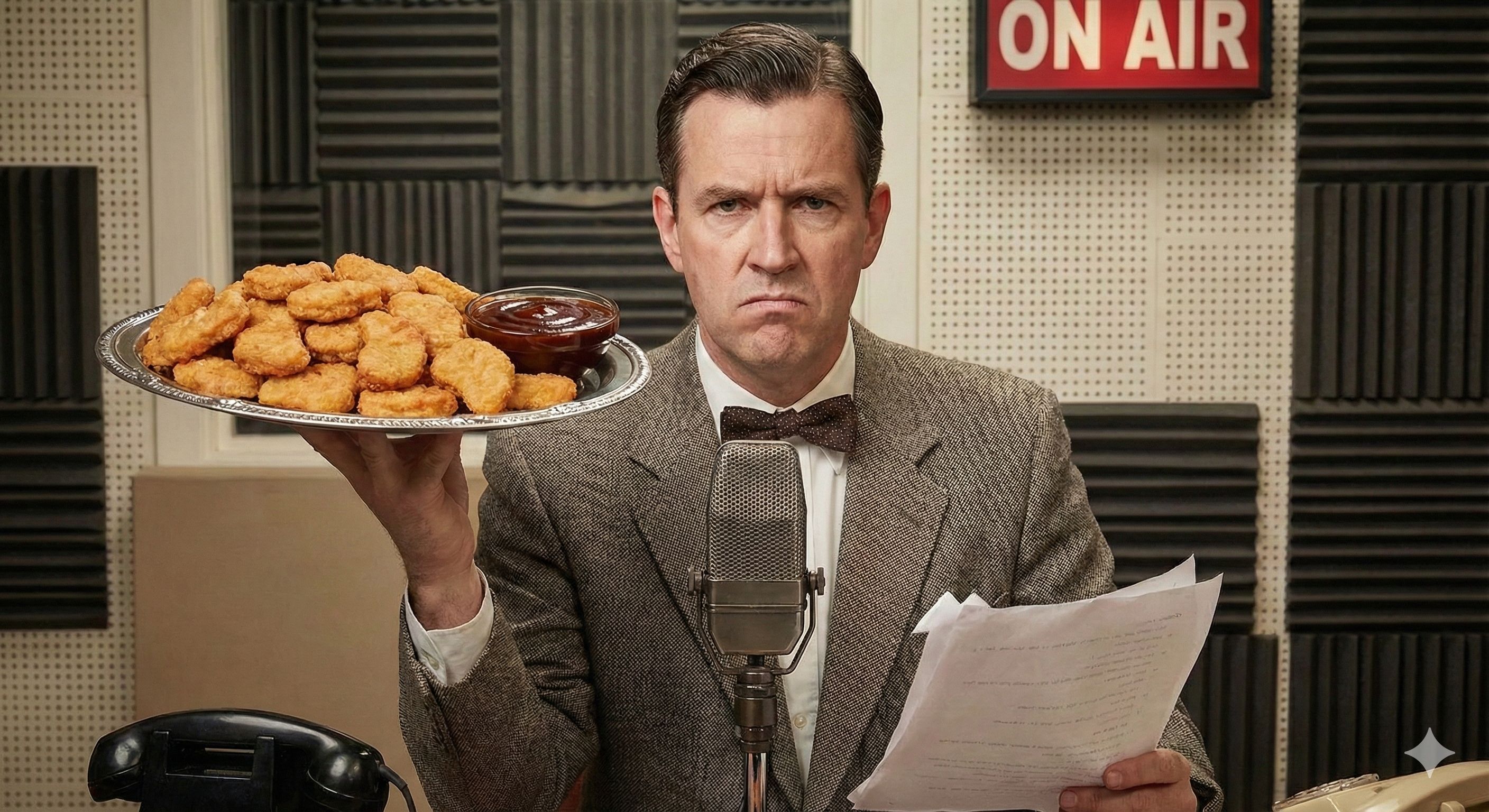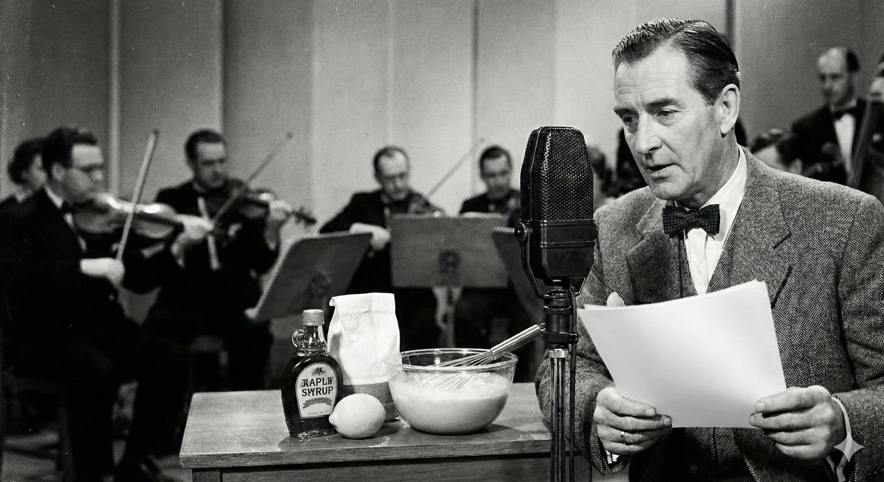 Audiobook, Spoken Word, 1950s BBC Broadcast, RP King's English Accent, Deep Male Voice, Italian Jazz, Accordion, Upright Bass, Noir Atmosphere, Stern, Gastronomic