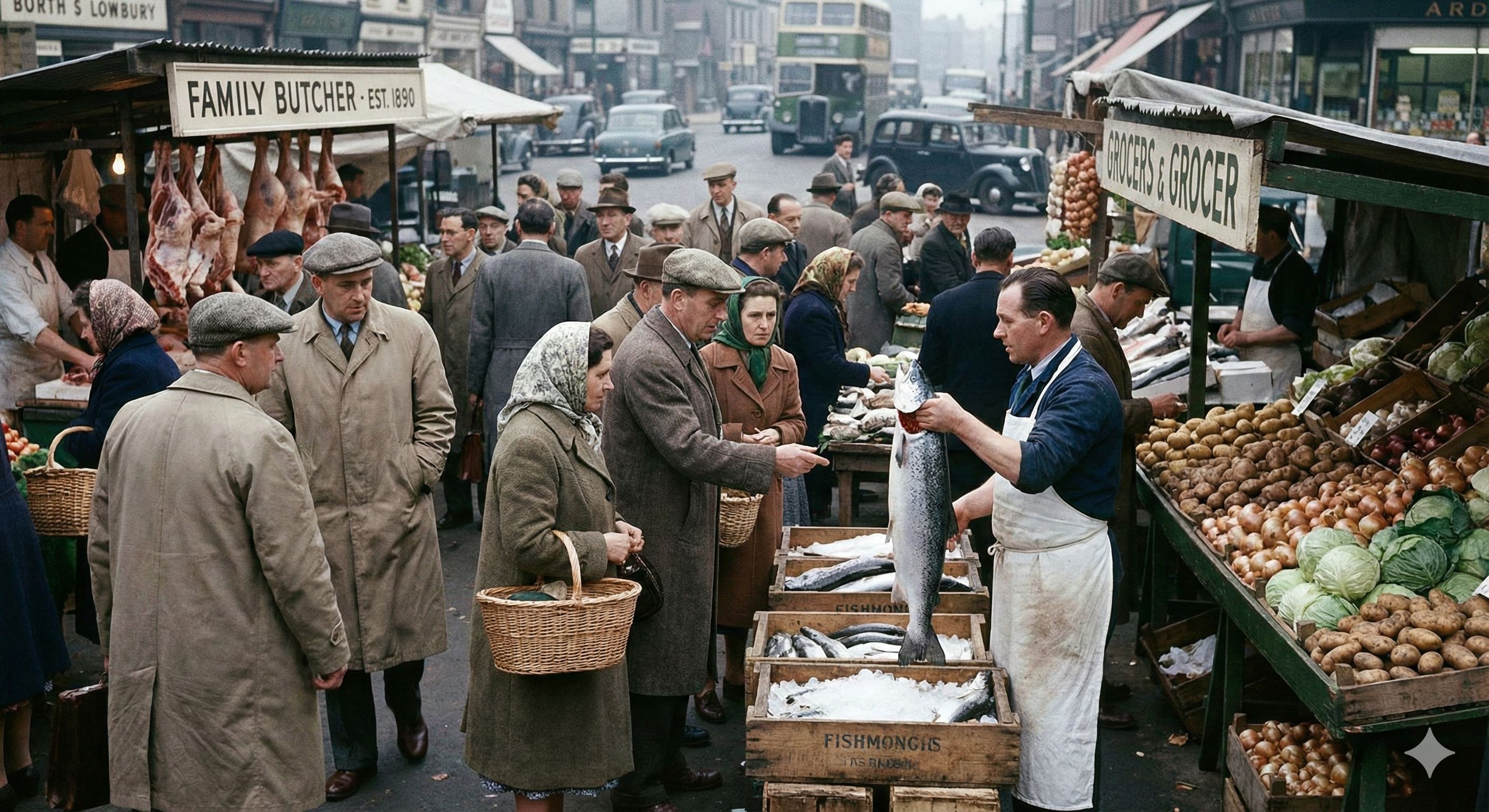 Audiobook, Spoken Word, 1950s BBC Broadcast, Bustling Market Ambience, Marching Band Snare, Tuba, RP King's English Accent, Pompous, Instructional, Measured Tempo