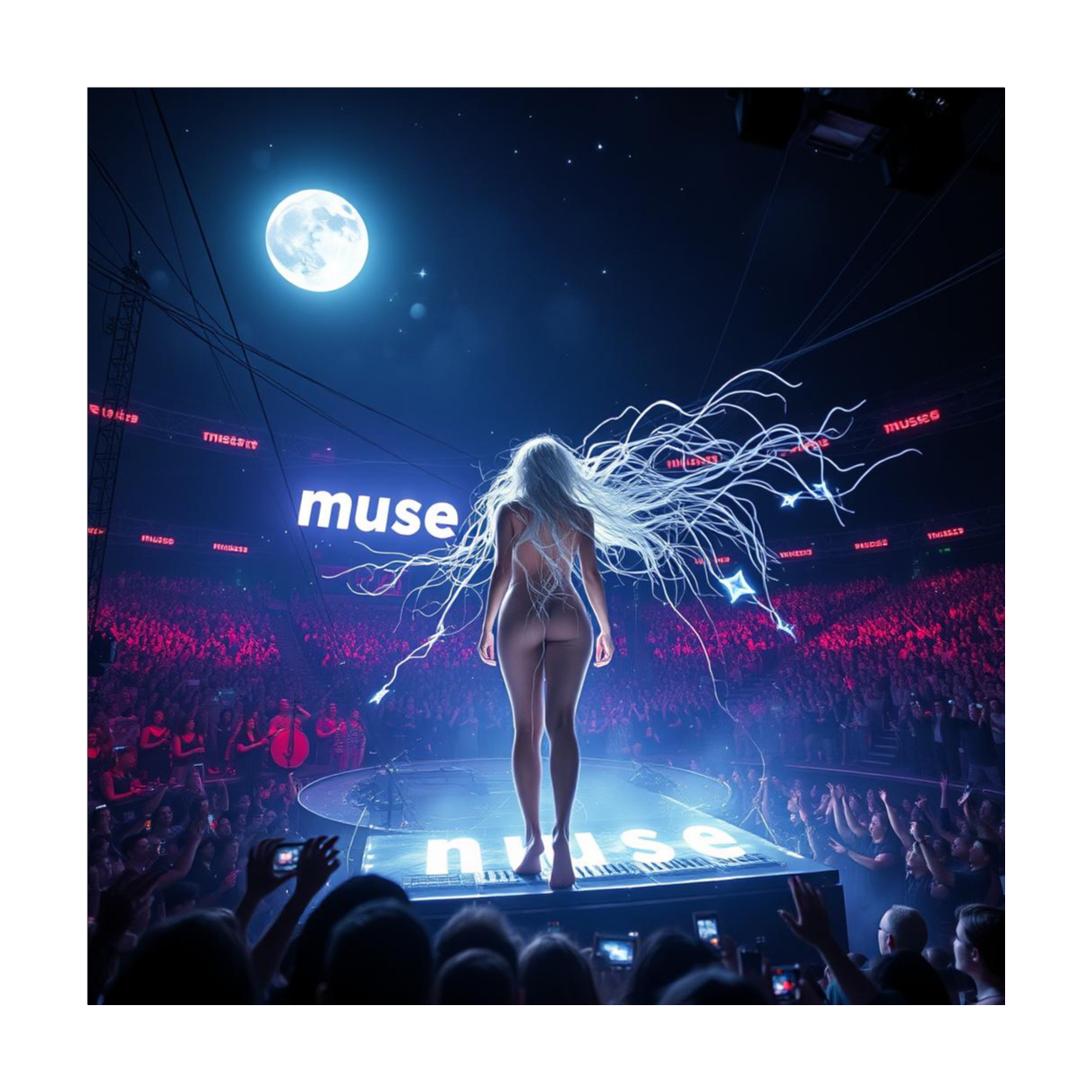 Dreamy, Atmospheric, Groovy, Indietronica, Synthwave, Epic, |Style:female main voice, only female voices, chor als female chois many girls, sub male voice, LIVE CROWD AUDIENCE, CALL AND RESPONSE, LIVE CONCERT!, cinematic, Massive open-air concert at night, a barefoot female performer with glowing silver hair stands center stage, surrounded by thousands of fans chanting 'Muse' in unison, Her presence radiates electric fire, moonlight, and glitch effects, The crowd is fully engaged—hands raised, faces lit by stage beams, call-and-response energy pulsing through the scene, Futuristic analog synths and orchestral strings fill the stage, with a gospel choir silhouetted behind her, The atmosphere is cinematic, emotional, and epic, Style: synthwave, cyberpunk, live concert, dramatic lighting, crowd immersion, ‑Black Metal, ‑Bubblegum Pop, ‑Christian Rock, ‑Dungeon Synth, ‑Opera, ‑Yacht Rock