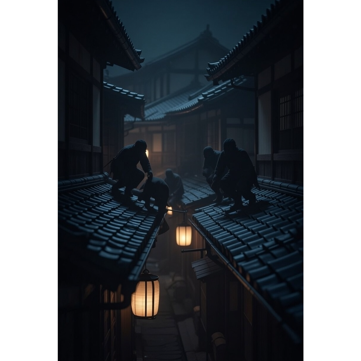 Heavy sound effects immersion: metal sword clashes and steel streaks, splintering wood cracks, shattering paper lanterns falling, blood dripping echoes, rooftop tiles scraping and creaking, distant thunder rolls, sudden violent impac