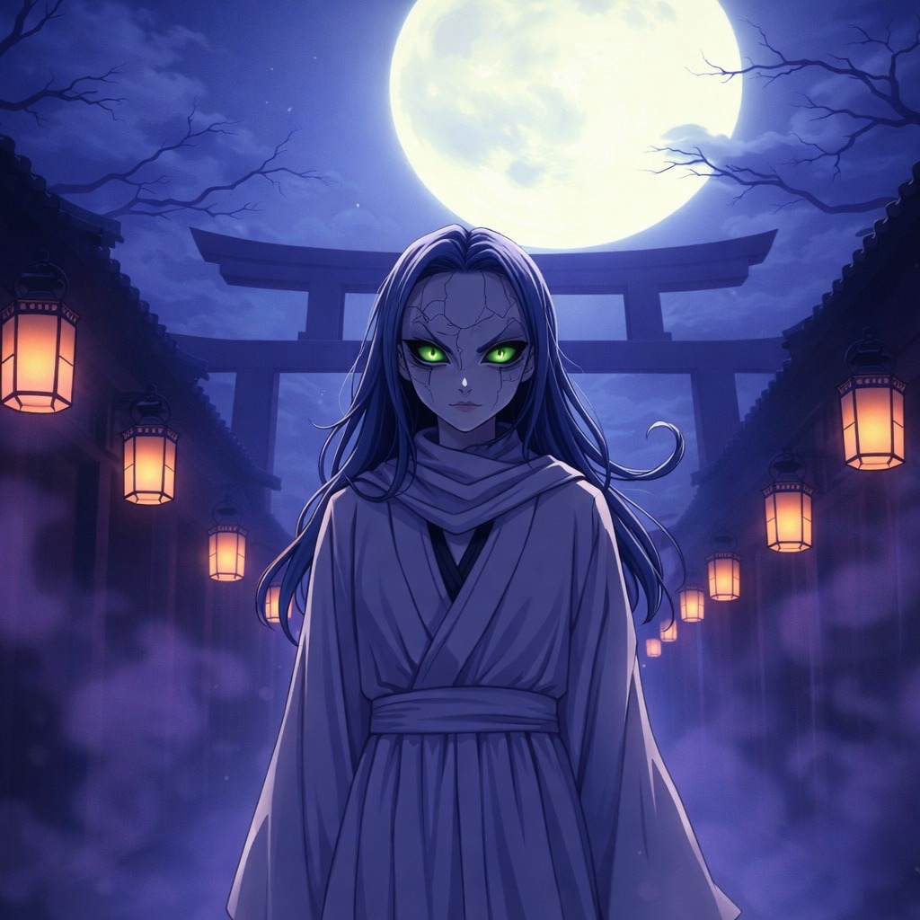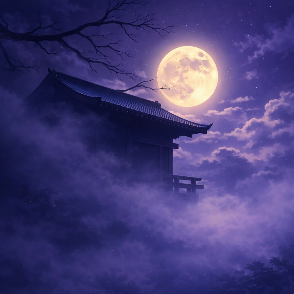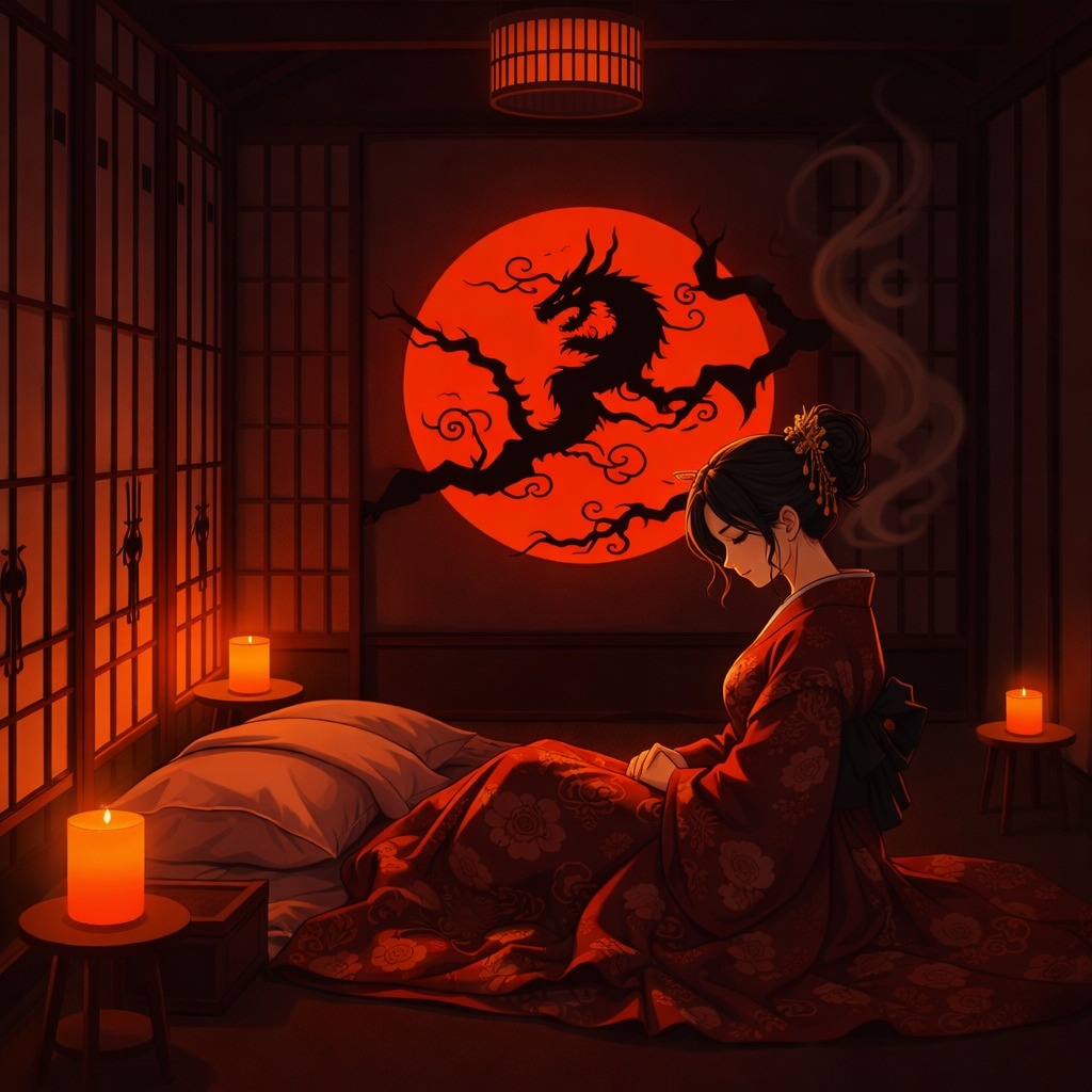 Subtle twisted Japanese night influences - faint echoing warped string motifs blended into guitar distortion, taiko-like thunderous percussion fused into rock kit, no pure traditional instruments dominant