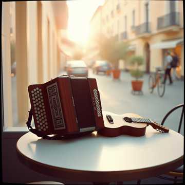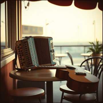 cheerful, relaxed, slightly retro, café atmosphere, ight upright bass, soft accordion background, no drums or only very subtle brushes