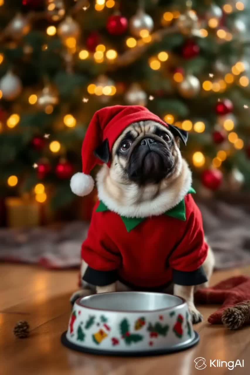 Funk, bouncy EDM, bells and claps, festive and cheerful, theatrical male tenoretto comic vocal, irritated and demanding tone of a dog begging for treats