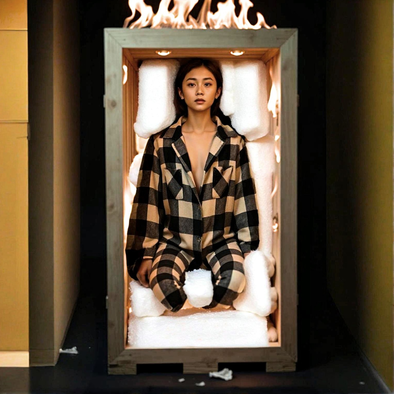 Crystalcore foundation with glistening bell-like synths, icy pads, and crystalline arpeggios fractured into glitch harmonics, Angular stutters, bit-crushed bursts, and digital static rip through the shimmer, distorting the glass-like soundscape, Marked sudden dips and crescendos create seasick swells and abrupt plunges, the whole track inhaling and collapsing in unpredictable waves, Spatial design is intentionally awkward: sounds pan hard left, vanish, then reappear behind the listener, like shifting walls in a funhouse corridor, Vocals float ghostlike, layered in translucent reverb, sometimes clear as cut glass, sometimes shredded into glitch echoes, The atmosphere is otherworldly and disorienting—equal parts delicate beauty and digital malfunction