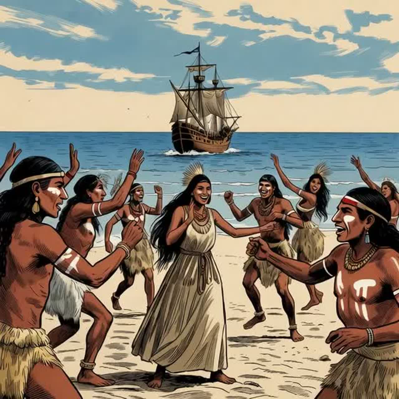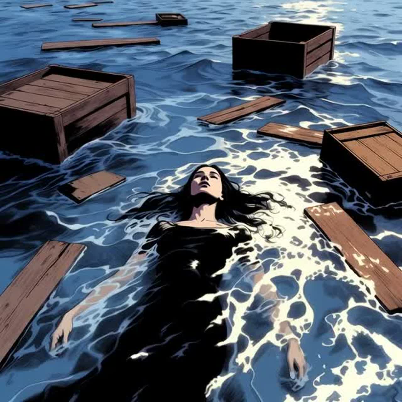 Dream-pop fused with traditional sea shanty aesthetics and epic cinematic scoring, Slow to mid-tempo nautical rhythm with a steady, wave-like pulse, Atmospheric pads and reverb-heavy textures create a misty ocean mood, Prominent emotional violin melodies acting as a narrative lead instrument, shifting from warm and curious to dark and dramatic, Male choir chants inspired by classic sea shanties, evolving into large epic choral harmonies in later sections, Percussion starts minimal (wooden stomps, muted drums), gradually adding deep toms and cinematic hits during the storm, Vocals start playful and mocking, then become strained, desperate, and finally solemn, Strong dynamic build-ups, long instrumental passages, and a powerful epic climax with full choir, layered violins, and dramatic pauses, Overall feeling: adventurous, ironic, ominous, and ultimately tragic