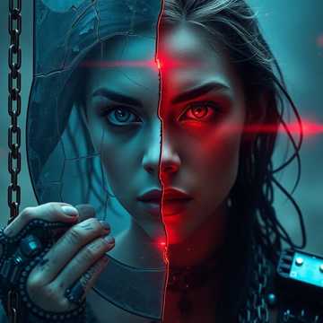 synthwave industrial metalcore, Female Clean Vocals, Female Harsh Vocals, Male Harsh Vocals, transhumanism theme, dueling vocals, aggressive electronic, Modern Metal, Tech Metal