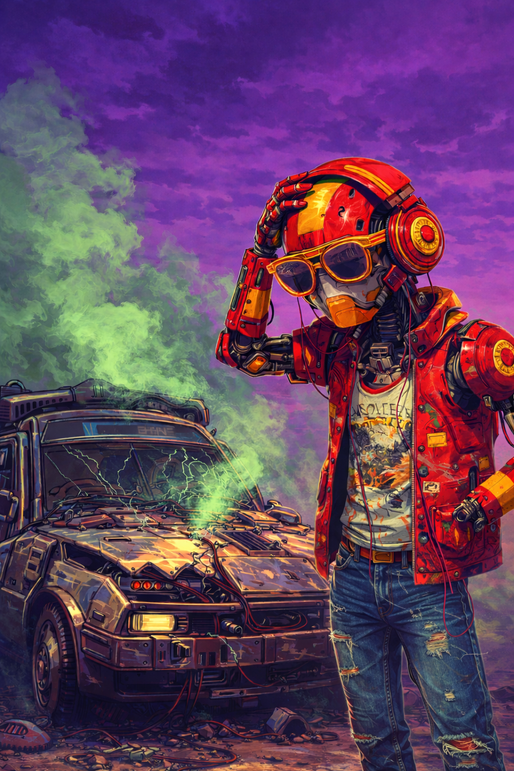 cyberpunk rave rebellion, aggressive punk electronica meets neurofunk drum and bass and euphoric trance, raw distorted guitars + snarling punk vocals, fast rolling 170-175 bpm amen breaks + neuro basslines, huge supersaw trance leads + hands-in-the-air synth stabs, pounding distorted 4x4 kicks bleeding into dnb, chaotic yet hypnotic, high-energy festival destroyer, gritty + futuristic, intense breakdowns into massive euphoric drops