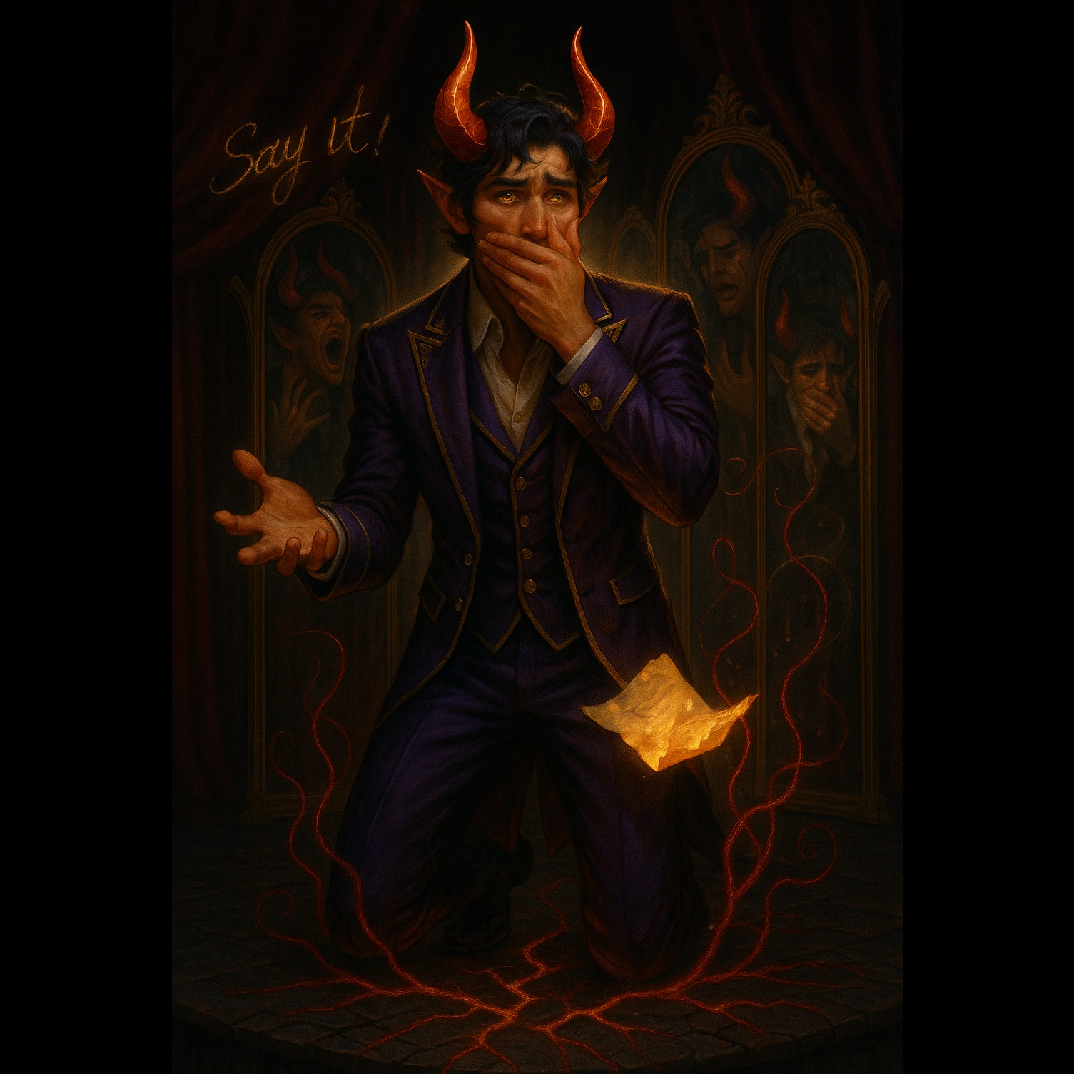 theatrical rock, baroque pop, brass fusion, dramatic inner monologue, swing punk, emotional confession, cinematic, SpokenWord, VocalLayer, GroupChant, InnerVoice, EchoFX, Post-Emotional alternative rock with introspective lyrics and driving energy, Mid-to-fast tempo, Start with a rising ambient guitar intro that swells into the intro, Verses feature clean guitars with light chorus effects and steady drums, Choruses hit harder with layered distorted guitars and more intense vocal delivery, Bridge pulls back slightly with ambient guitar reverb and light percussion before building back up, Outro repeats key lyrics with echo, Raw, honest vocal tone with light vocal layering, Think bittersweet resilience and emotional release, Add ambient "ohhh"s and vocal echoes for emotional impact, trap swing, acid jazz, edm soul, jazzy, theatrical, electro vaudeville, haunting vaudeville, deals with the devil, chaos, madness, loosing myself, scat, devilish scat, demonic swing, sly male vocals