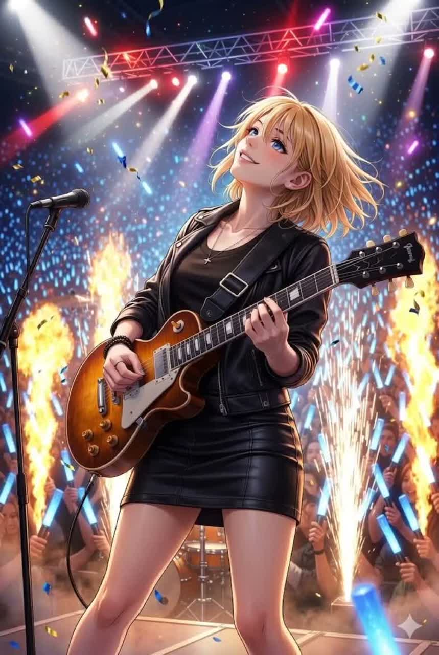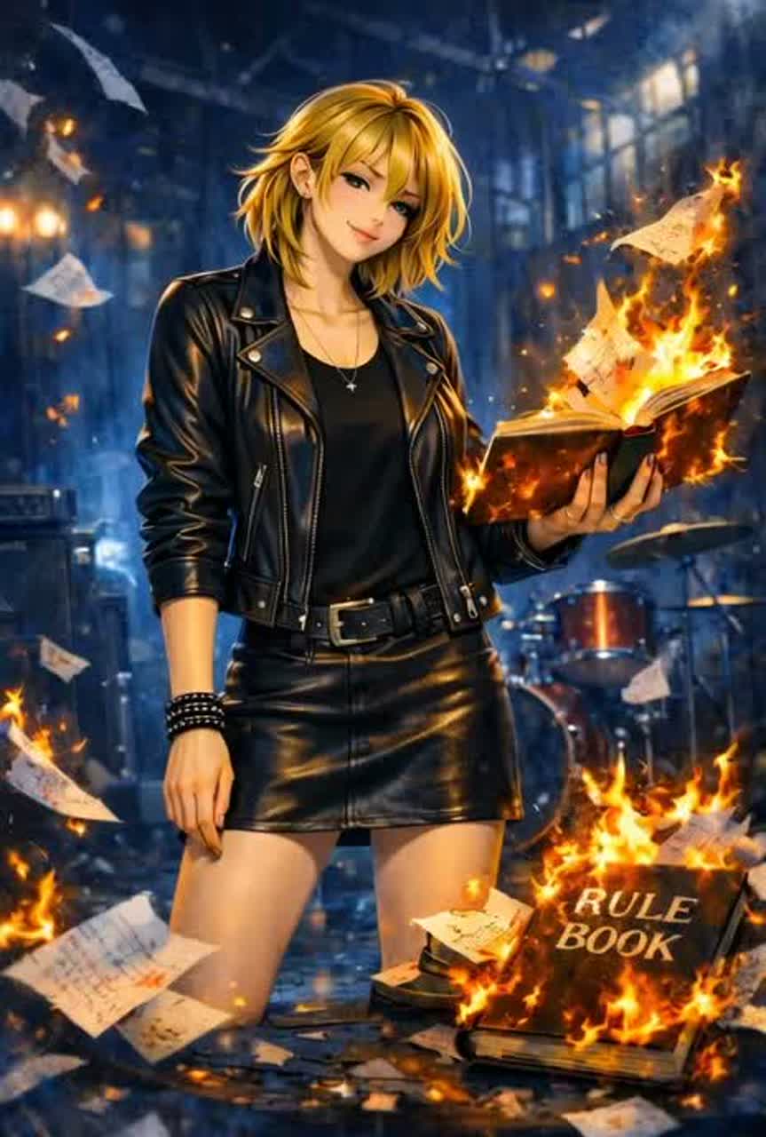 Fast anthem rock, 155BPM, driving groove, punchy drums, distorted guitars, big chorus, cute playful female vocal, LOW (Below 120Hz)