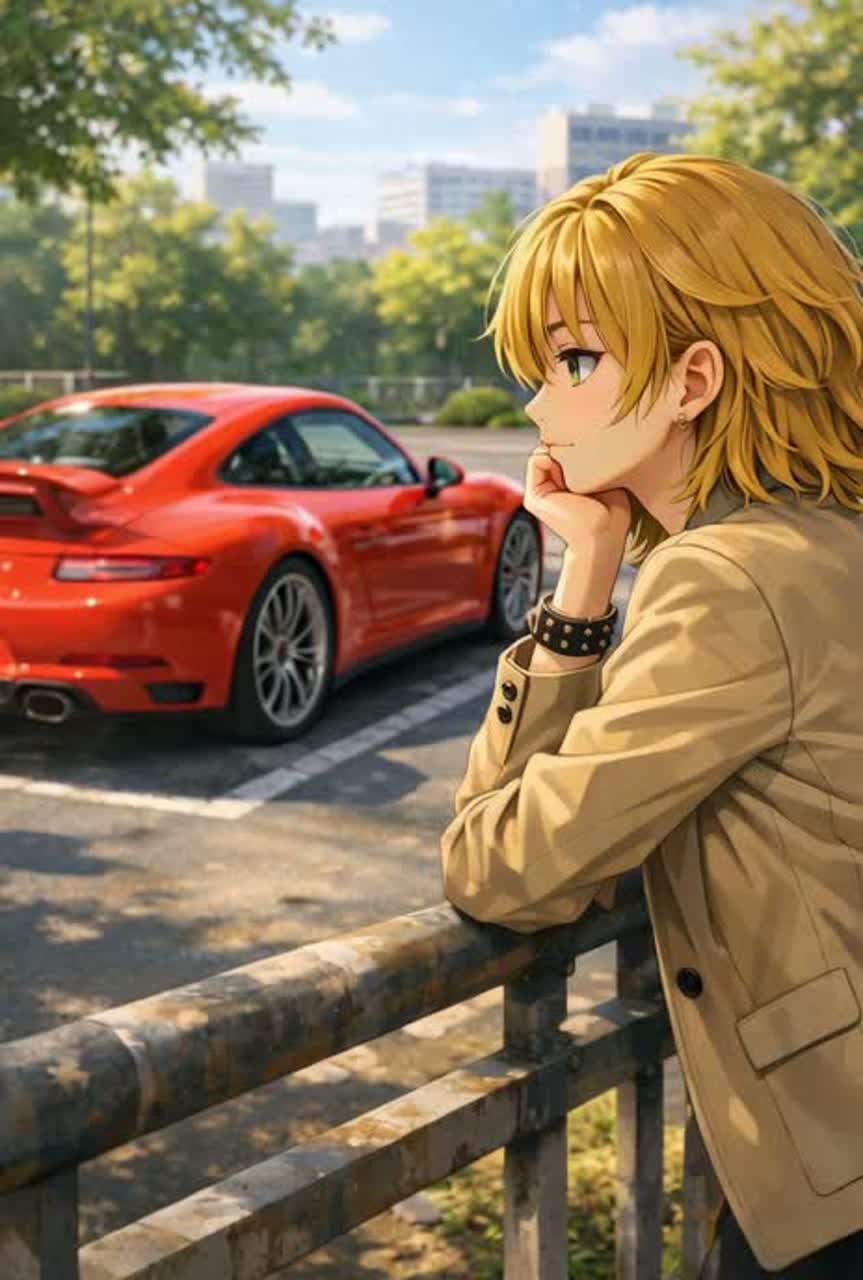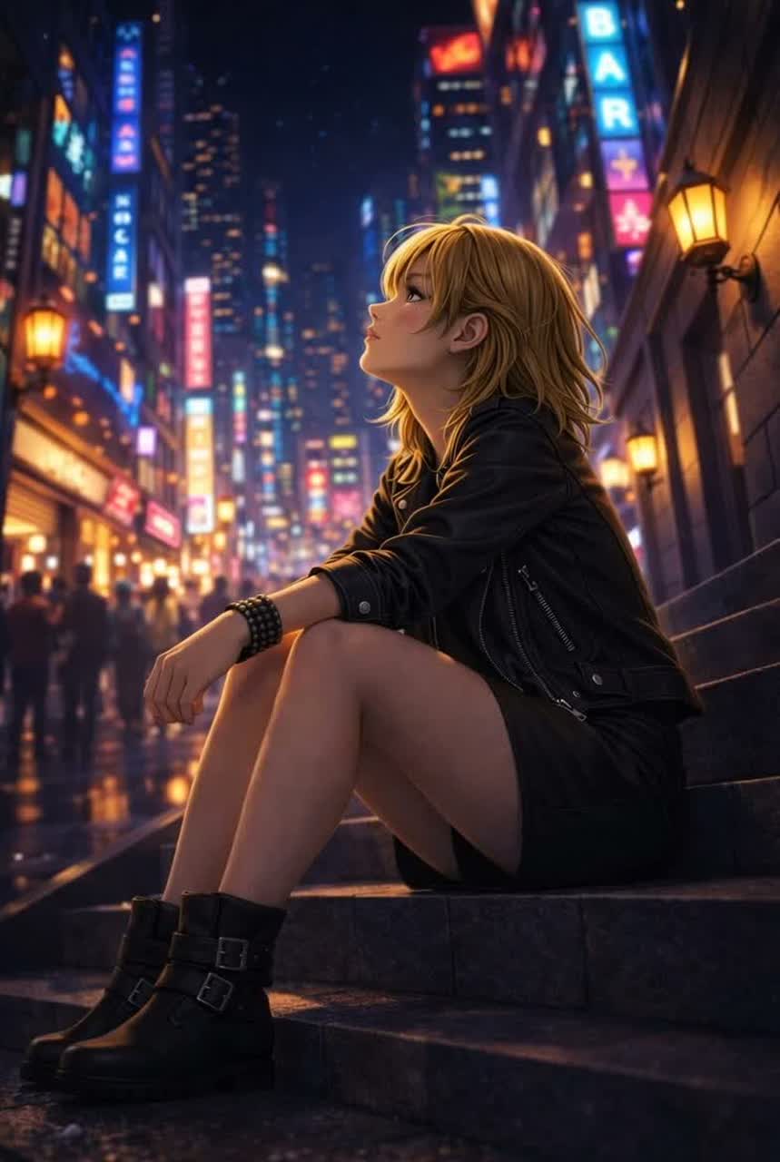 J-pop anthem rock, dotted-eighth delay guitar intro, crunchy midrange guitar riffs, raw overdriven pentatonic rhythm guitar, sharp snappy snare, bouncy driving bass groove, symphonic string stabs, stacked choir harmonies, plate reverb, analog tape saturation, bright major key lift, arena chorus payoff, sleazy rock swagger, high-fidelity mix, upbeat momentum