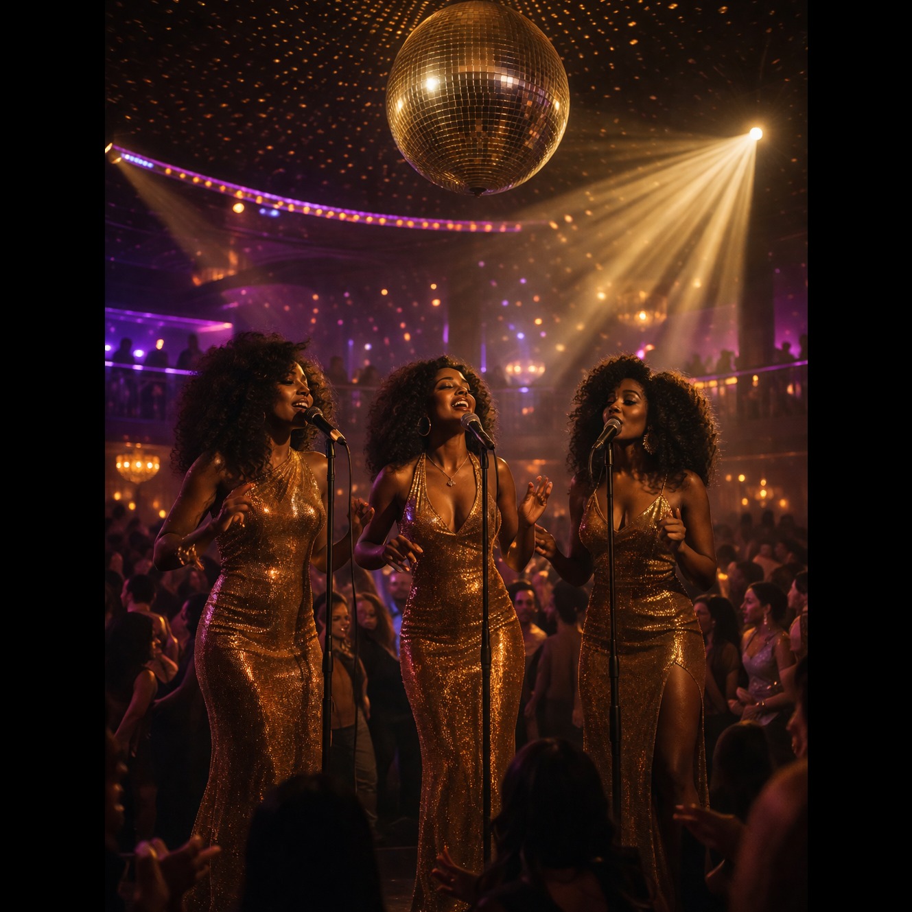 Live concert, live shout chorus, call and response, Disco soul female trio with rich gospel harmonies, bright brass section, groovy bassline, handclaps, uplifting festival vibe, call and response, catchy chant hook, 110 BPM, Key: C Major, live feel, no trap, no EDM drop