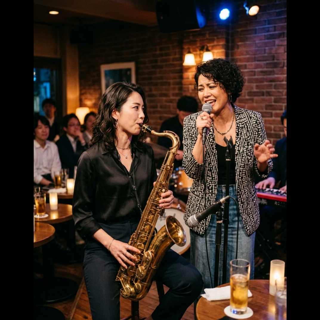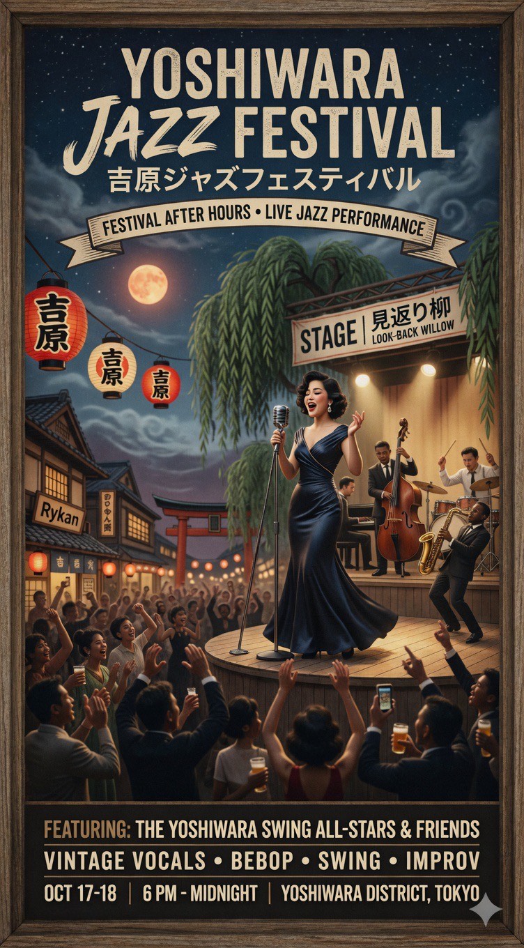 Live performance, Female Jazz Vocal, 1950s Swing, Bebop, Piano Trio with Saxophone, Cinematic, Yoshiwara Jazz Festival, Crowd applause and cheering, Sophisticated, Improvisational, Warm Room Acoustics, Authentic Live Jazz Club Vibe