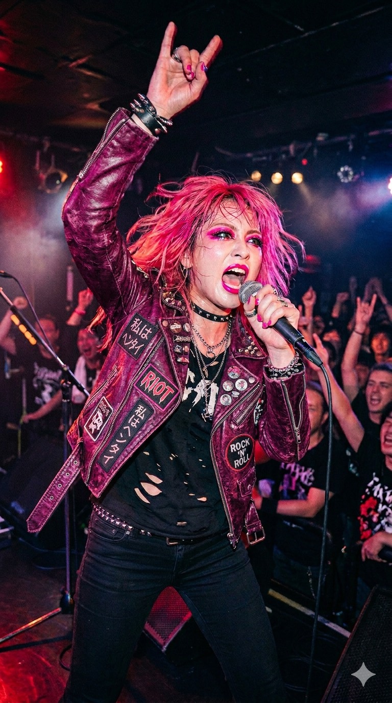J-pop punk-pop live band with driving four-on-the-floor drums, crunchy rhythm guitar, handclaps on the hook, and a shout-along chorus that keeps verses tight and playful; pre-chorus strips to bass and crowd clap, chorus bursts with gang vocals, short delay throws on the key phrase, and a final lift with tom fills and shouted ad-libs, Bright, punchy, sweaty-live mix with close-mic lead and wide backing vocals