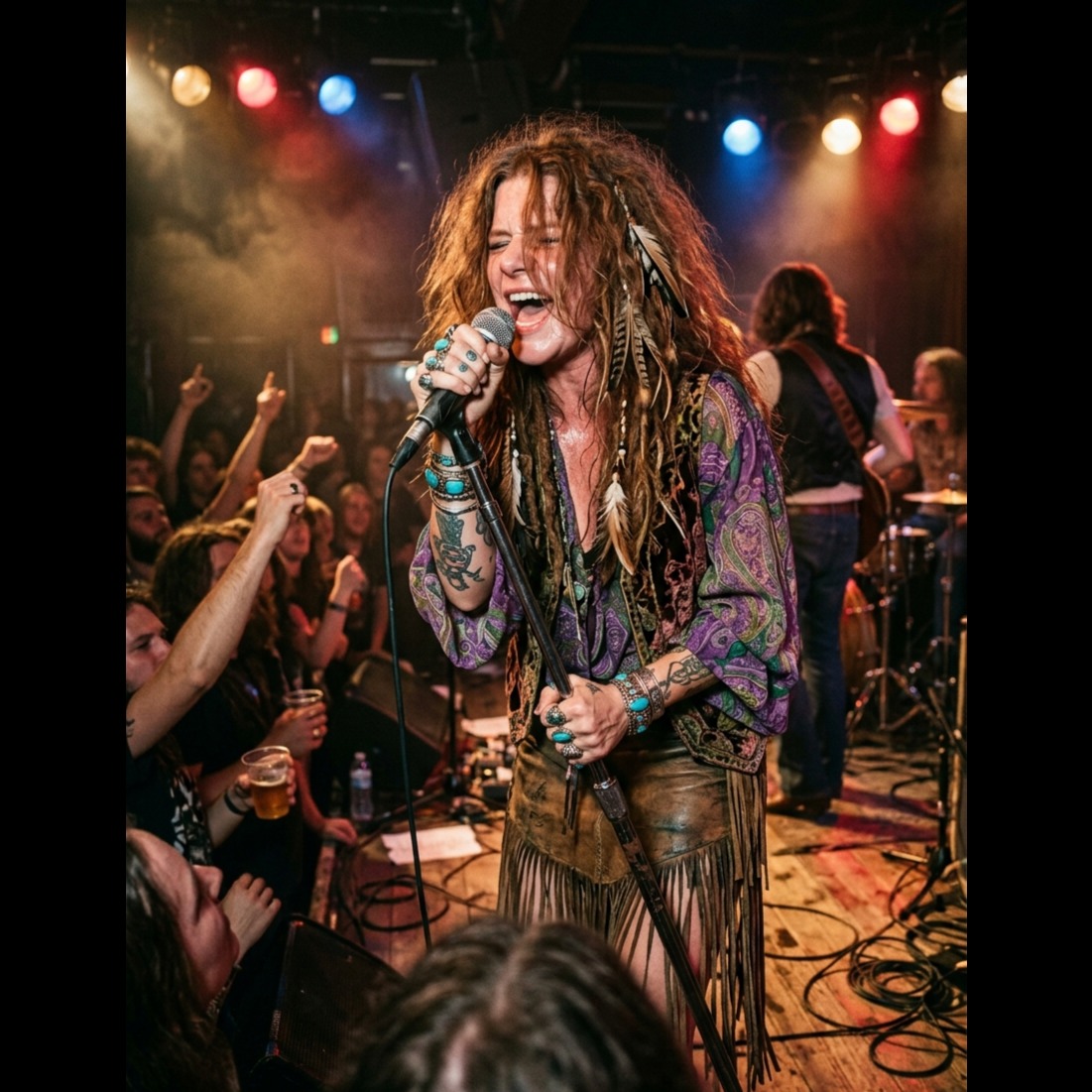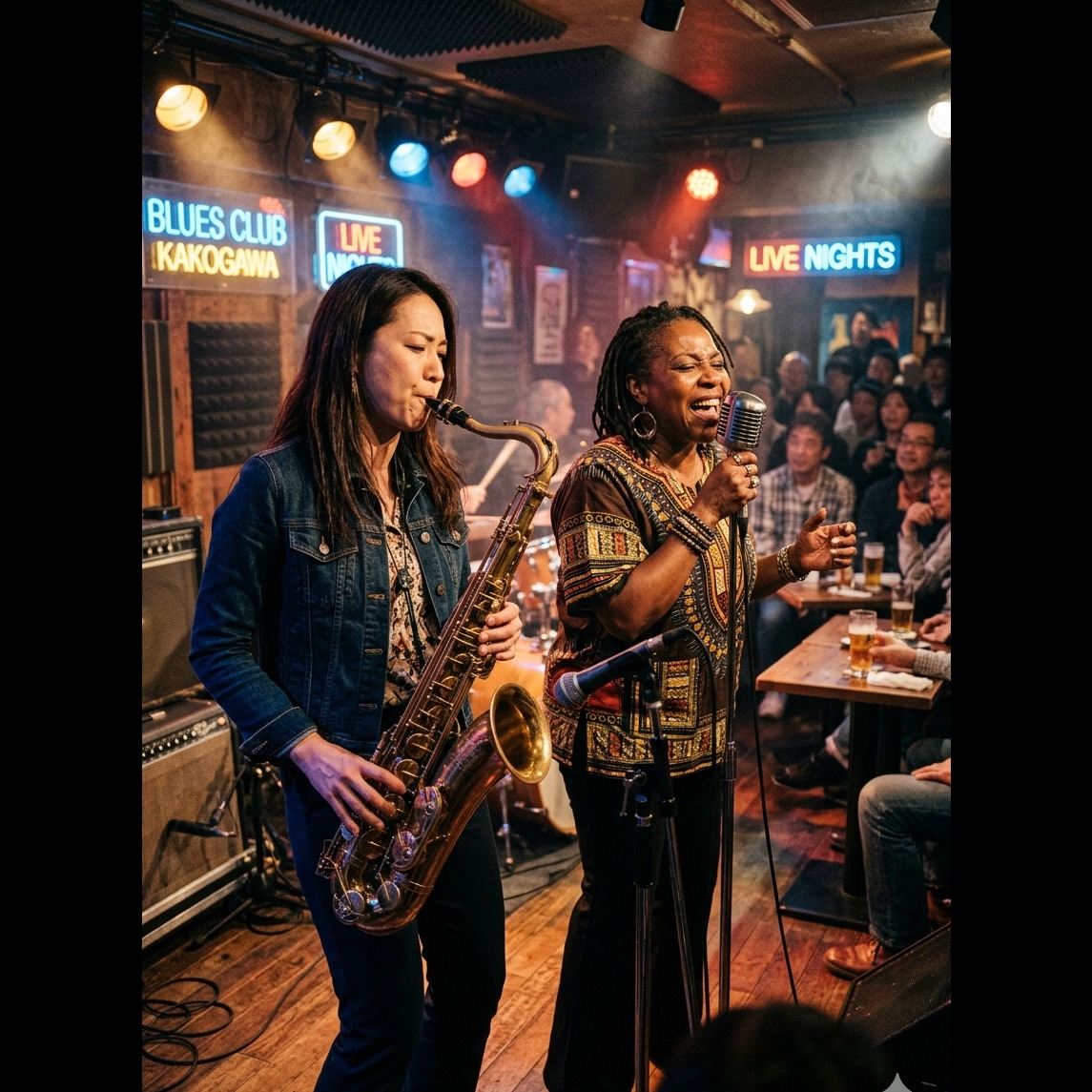 Live concert, Blues Rock, Soul, Japanese Traditional Folk, Minor, 98BPM, Husky expressive female alto vocal with kobushi, live shout chorus, Crying tremolo lead electric guitar(slow tremolo, wide vibrato, emotional bends), 2nd electric guitar(rhythmic chord backing, light overdrive), tenor saxophone(soulful tone, expressive vibrato, bluesy phrasing), vintage combo organ(warm chord stabs, slight overdrive), drums(dynamic groove, solid backbeat, live feel)