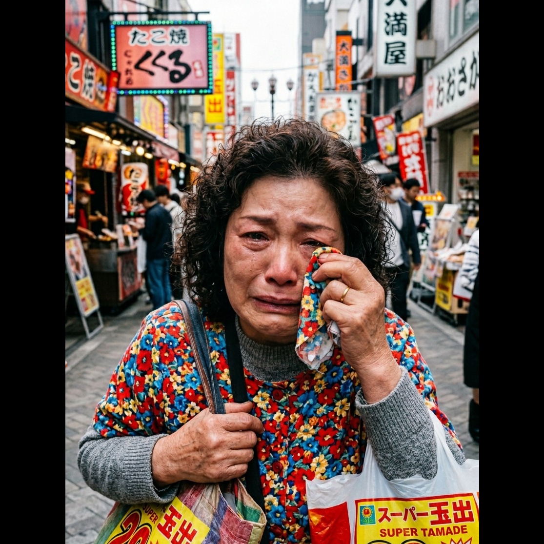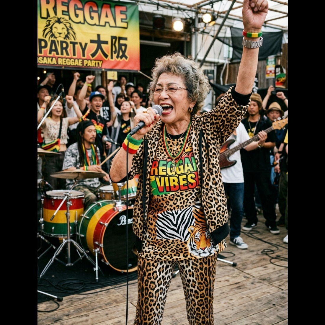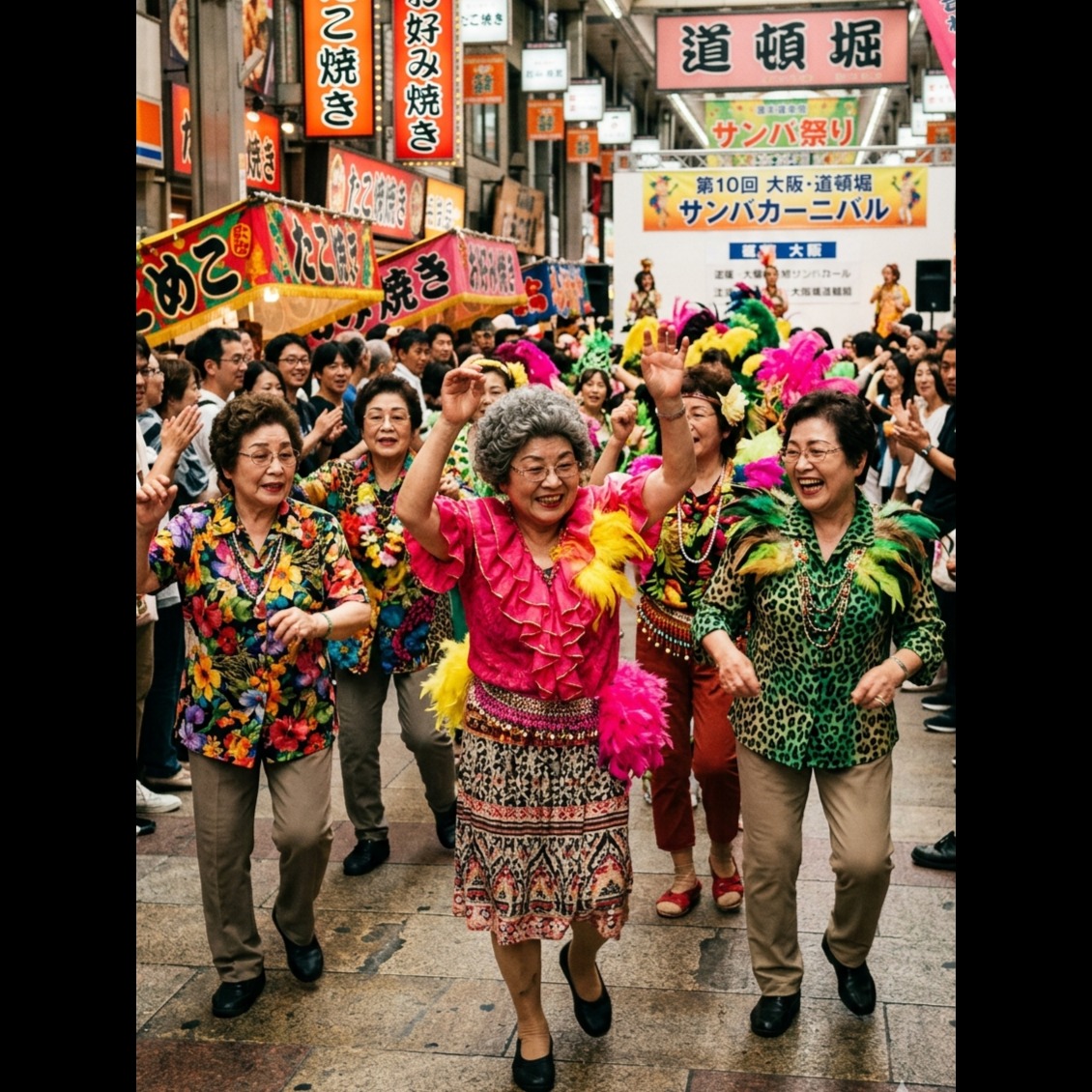 Samba, Latin Rock, String Ensemble, Minor, 142BPM, Powerful female alto vocal, live shout chorus, call and response, Violin(arco, vibrato), Violin(pizzicato), Viola(arco), Cello(arco, tremolo), Double Bass(slap), A bold Osaka working-class woman struts through the city street in leopard print, tossing candy to strangers, shaking her hips to samba rhythm, laughing loud enough to rattle the shop shutters, declaring her unstoppable energy to the whole neighborhood