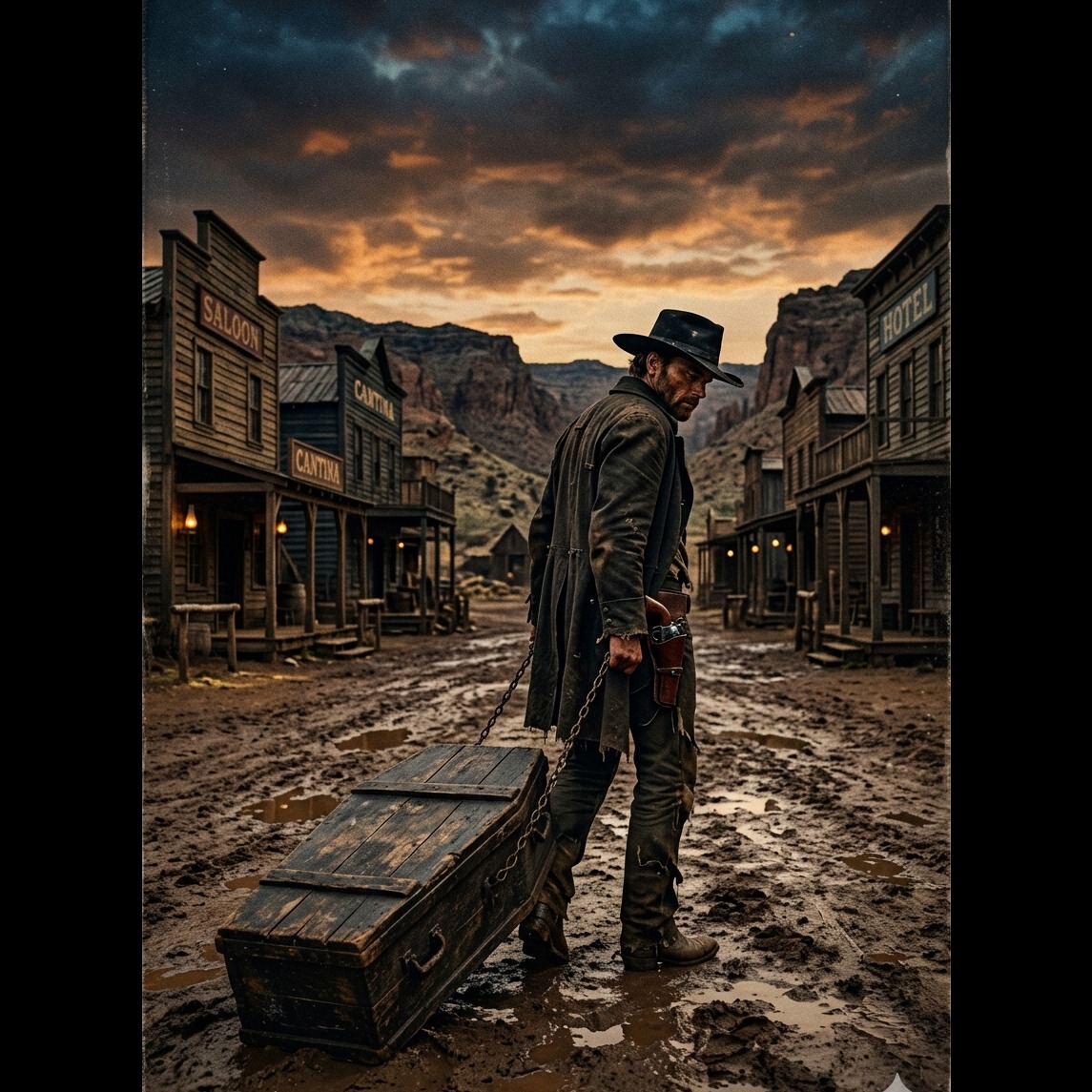 Spaghetti Western, cinematic, dark hard rock, live concert, minor, 112BPM, powerful male bass vocal, live shout chorus, call and response, whistle(melodic lead), harmonica(bluesy riffs), electric guitar(heavy riffs), 2nd electric guitar(rhythm power chords), electric bass(driving groove), synthesizer(dark pads), tenor saxophone(raw solo), drums(hard driving), A hunted outlaw with no home, no mercy, no way back—runs through dust and darkness until the last bullet flies