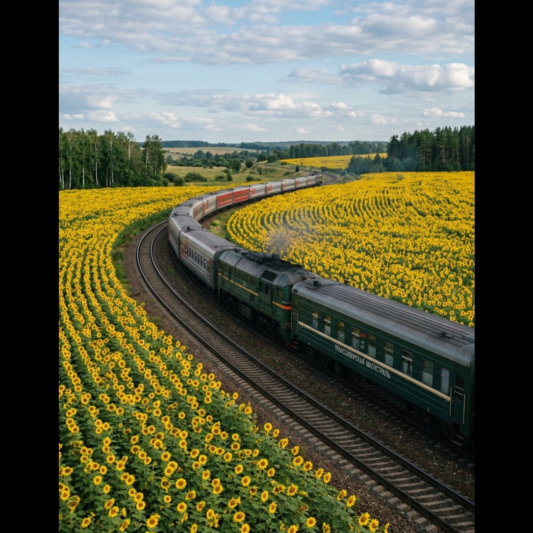 live concert, russian folk, rock ballad, minor, 110BPM, clear female alto vocal, live shout chorus, call and response, electric guitar(emotional lead, clean to overdrive), 2nd electric guitar(balalaika style picking, bright tone), electric bass(warm, steady groove), synthesizer(atmospheric pad), tenor saxophone(melodic, melancholic), drums(slow rock ballad, brush and snare), a lonely farewell in a vast sunflower field, watching a departing train to Vladivostok, memories and sorrow of separation