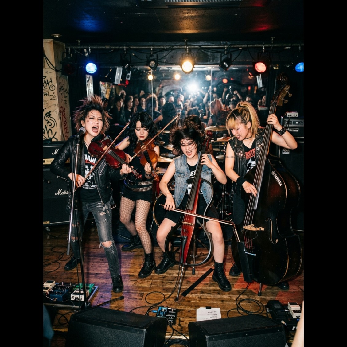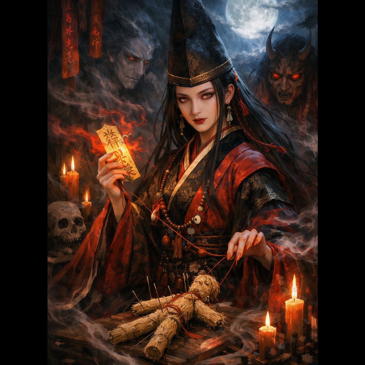Live concert, cyberpunk, industrial, horrorcore, Japanese traditional ensemble, minor, 124BPM, female low growl vocal, live shout chorus, female screaming and shrieking, masterful shamisen (virtuosic fingerpicking), shamisen (three-finger picking), bass Tsugaru shamisen (heavy low-register plucking), masterful koto (precise plucking), koto (bowed with horsehair bow), shakuhachi (breathy dark tone), shinobue (piercing high register), taiko (thunderous striking), tsuri-daiko (resonant mallet striking), dream manipulator creeps into sleeping minds, weaving love and murderous intent, a female onmyoji walks the path of dark sorcery through night