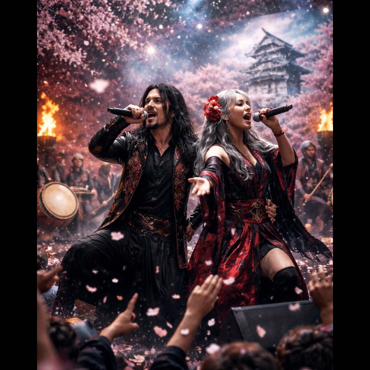 live concert, cinematic heavy metal, minor, 124BPM, low male baritone vocal and powerful female vocal duet, live shout chorus, call and response, electric guitar(shamisen style picking), 2nd electric guitar(rhythm shamisen style), electric bass(tsugaru shamisen style), flute(shakuhachi style), synthesizer(koto style), synth pad, drums(wadaiko style), a dramatic tale of harsh winter giving way to explosive cherry blossom spring with intensity and fleeting beauty