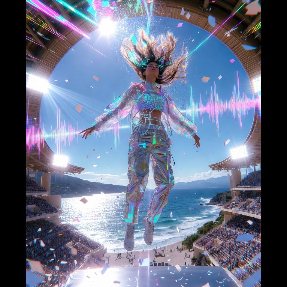 Acid Jazz meets Psychedelic Trap, BPM 150, Hyper-budget open-air live performance, massive stadium acoustics, 3D holographic soundstage, Panoramic mix, interactive massive crowd, Viscous slap bass, retro Rhodes, live brass section, 808 glides, J-pop glitch vocals, 8-part soulful harmony, Aggressive, euphoric, polyrhythmic live band energy, Grand finale cadence, definitive ending