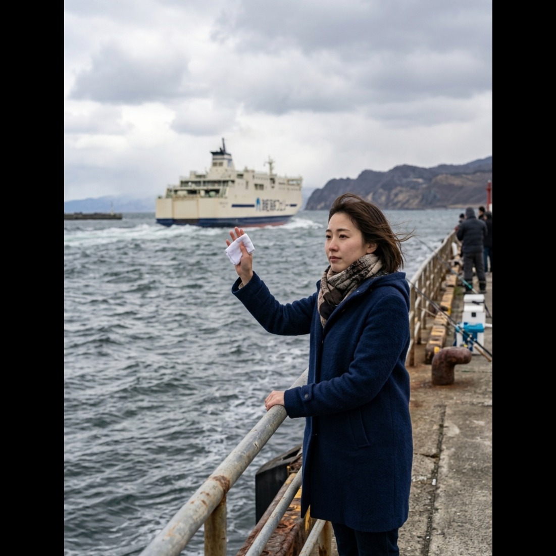 Live concert, blues pop rock, J-pop, enka, Japanese traditional instrument ensemble, Minor, 120BPM, Sad female alto vocal, live shout chorus, call and response, Lead shamisen(melodic lead lines), virtuoso koto(expressive fingering), shamisen(three-finger picking), koto(percussive strumming), bass tsugaru-shamisen(deep groove), shakuhachi(breathy long tones), shinobue(high piercing phrases), odaiko(heavy downbeats), wadaiko(driving rhythm), tsuridaiko(resonant accent beats), A woman stands frozen on the pier of Tsugaru Strait, watching the ferry disappear into rough spring waves, unable to leave, tears falling
