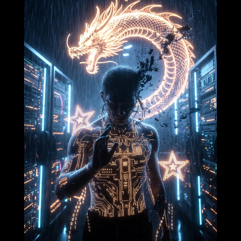 Live concert, cyberpunk, synth rock, minor, 140BPM, powerful growl male vocal, live shout chorus, call and response, electric guitar(distortion riffing), 2nd electric guitar(lead soloing), electric bass(driving slap and pick), synthesizer(arpeggiated sequences), synth pad(atmospheric layering), trumpet(aggressive staccato), drums(hard hitting double kick), A cyber onmyoji hacks the spirit grid with ancient seals and AI shikigami, purging demons from the digital darkness