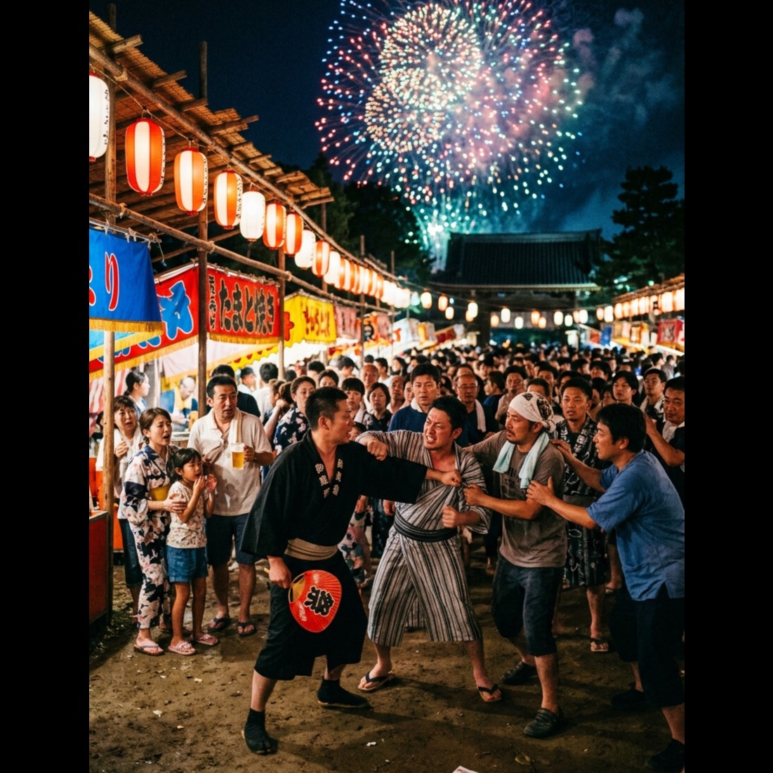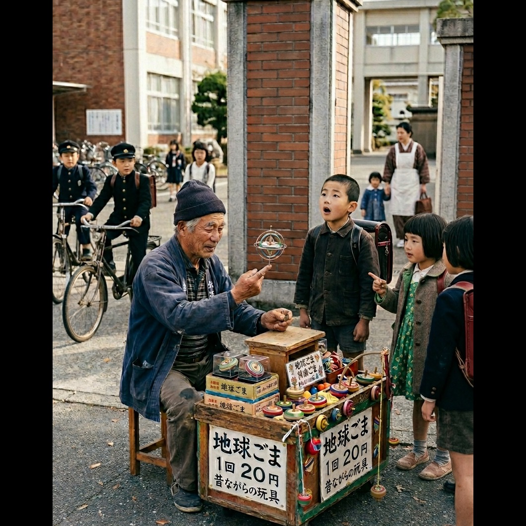 Live concert, Japanese folk song, new age, city pop, minor, 126BPM, male bass vocal, live shout chorus, call and response, acoustic guitar(long high-speed arpeggio), acoustic rhythm guitar(strumming), violin(melodic), harmonica(blues bending), drums(brush and stick), nostalgic memories of childhood toy vendors at school gates, the mystery of a floating sinker and a spinning top that never falls, longing for a vanished era and the warmth of those old men who sold simple wonders