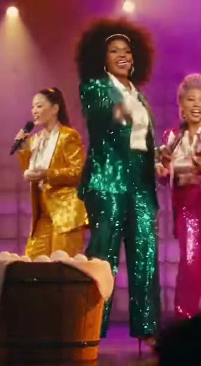 Live concert, Motown, Nu Disco, Soul, Minor, 120BPM, Female trio vocal, live shout chorus, call and response, applause and loud cheering, rich harmony layers, smooth lead with sweet falsetto backing, Electric guitar(clean rhythm, chucking, muted strum, wah accent), electric bass(warm groove, walking melodic line), drums(disco four on the floor, tight snare, open hi-hat), rhodes piano(smooth chords), string ensemble(lush staccato and legato swells), brass section(trumpet, trombone, punchy hits), handclaps, percussion(shaker, tambourine), uplifting glamorous dancefloor love and unity vibe with elegant soulful energy