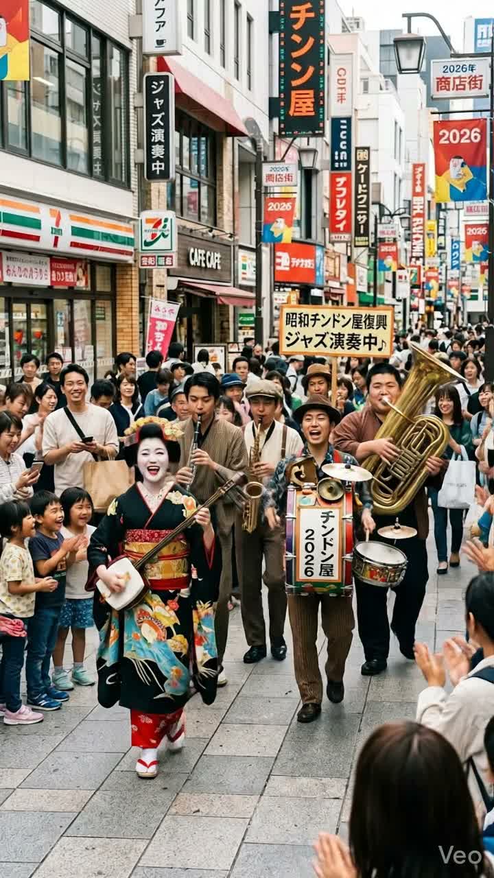 Japanese Chindonya-style street performance music with jazz and swing influences, The arrangement features a bright, piercing clarinet playing melodic leads and improvisational runs, a traditional chindon drum set consisting of a small snare and a woodblock-like chime, and a tuba providing a bouncy, staccato bassline, An accordion provides harmonic accompaniment with rhythmic chordal pulses, The tempo is a brisk 145 BPM in 4/4 time, Vocals are energetic, shouted call-and-response style typical of street barkers, featuring both male and female voices, The clarinet uses frequent trills and glissandos, while the percussion maintains a steady, march-like swing feel with prominent woodblock accents