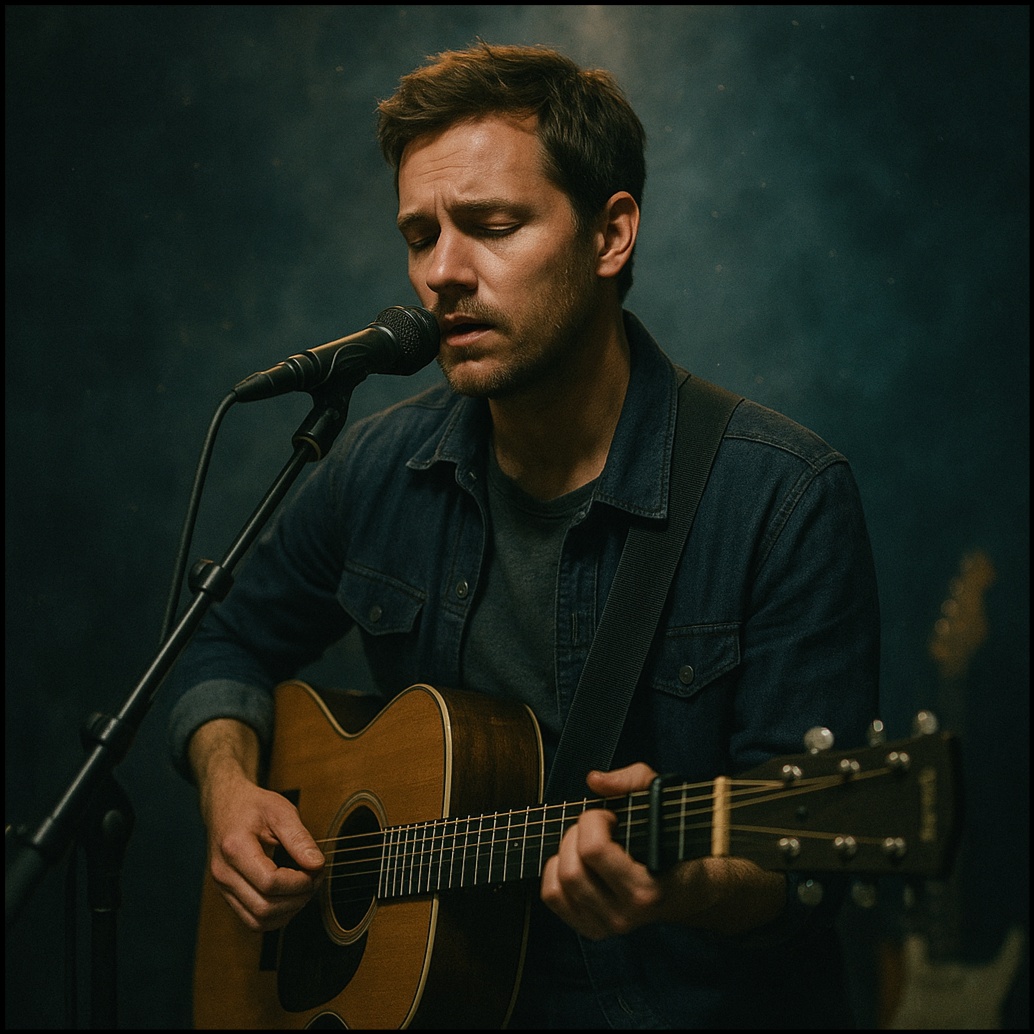 Instruments: Fingerpicked acoustic guitar, soft piano, ambient synth layers, subtle percussion, and atmospheric textures, Gradual build with strings or electric guitar swells toward the climax, Vocals: Gentle, heartfelt male vocals, Intimate and vulnerable in verses, emotional and soaring in choruses, Mood: Melancholic, intimate, emotional, Themes of love, memory, and longing, Production: Spacious and atmospheric, with reverb-drenched instruments and vocals, Builds gradually from fragile verses to a lush, cinematic chorus