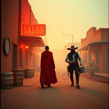 Rowdy Spaghetti-Western romp with swaggering male vocals, twangy tremolo guitars, honky-tonk piano fills, and stomping boots-on-wood percussion, Verses ride a loping, dusty groove; chorus explodes with gang shouts, whistled hooks, and stacked harmonies, Harmonica and barroom upright bass underline the comedy, with a whistled outro and crowd-chant feel on the final hook, fake