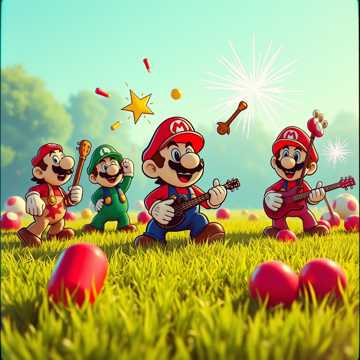 Bouncy kids’ anthem energy, bright chiptune synths and claps, male vocals, Simple, repetitive melody with call-and-response feel; each character gets its own playful motif, Big group singalong on every “doo doo” hook, with 8‑bit coin blips and cartoon sound FX sprinkled between lines