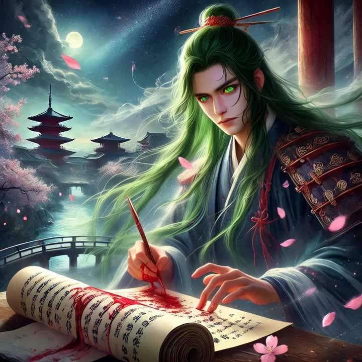 clean, clear, studio quality, dark, anime opening, japanese folk, symphonic metal, dramatic, cinematic, emotional, tragic, fast tempo, 4/4, E minor, shamisen, violin, electric guitar, electric guitar, taiko drums, orchestral, gregorian chant, ambient, deep male vocals, powerful voice, cinematic drums, string ensemble, poetic, cinematic amazing, male vocal, masterpiece, fusion, mashup