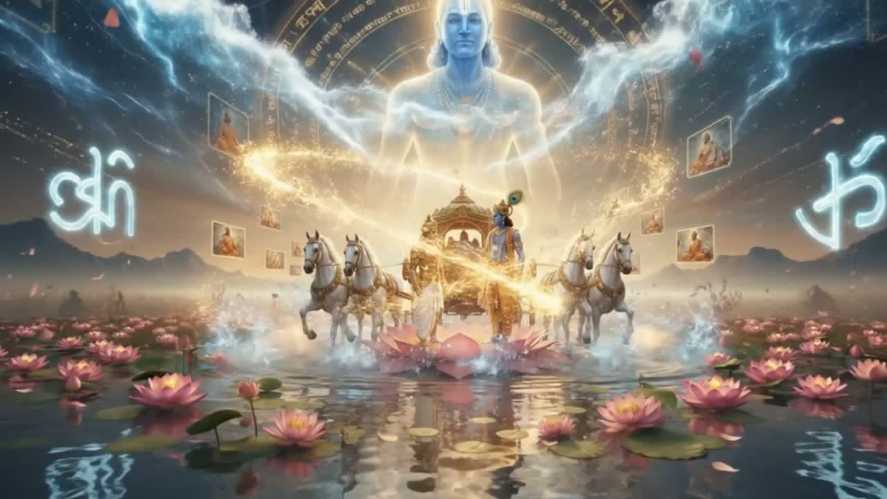 100 BPM hard bounce, INTRO: 10-sec miracle flute with water drops, massive kick drum drop at 6-sec establishing instant head-nod, heavy 808 bass locked in, VERSES: aggressive divine male rap, Krishna commanding Arjuna, punchy short phrases landing on kick hits, hard kick on every other beat creating bounce, deep 808 bass punching, trap snares, tabla rolls accentuating rhythm, miracle flute stabs between bars, HOOK: repetitive catchy chant, kick hits hard on "lotus lotus", infectious bounce impossible to resist, CHORUS: anthem energy, kick drum slams on key words "water" "duty" "destiny", massive bass drops, rapid tabla patterns, miracle flute carries melody with kick sync, BRIDGE: "yeah" ad-libs on each kick hit, call-response rhythm, BREAKDOWN: vocal chops timed with kick pattern, FINAL CHORUS: double kick intensity, OUTRO: miracle flute with thunderous kick hits fading, Heavy emphasis on kick-driven head-nod throughout, ‑soft ballad, ‑acoustic, ‑ambient, ‑chill, ‑slow tempo, ‑mellow