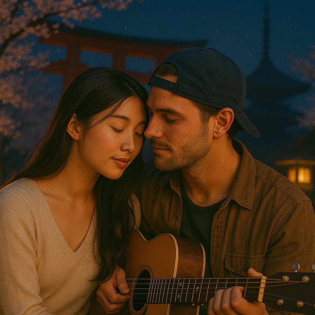 Magical, tender, and cinematic, Should feel like wandering through cherry blossoms, lantern-lit streets, and shrines at night — where modern romance meets timeless tradition
