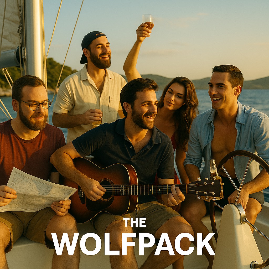 An upbeat, anthemic pop-rock song with Adriatic coastal vibes, Driving acoustic and electric guitars, steady drums, and rolling bass to match the rhythm of the sea, Add subtle Mediterranean touches (mandolin, accordion textures, handclaps) for flavor, Male lead vocal with warm, confident tone; big gang vocals in the chorus for sing-along energy, The song is about the Wolfpack sailing the Dalmatian Coast — adventures, beautiful women, food, drink, laughter, and friendship, The hook is strong and chantable: “Hey! Hey! We’re riding the waves tonight, Wolfpack rolling under Adriatic skies, ” Carefree, celebratory, perfect for summer nights on the sea