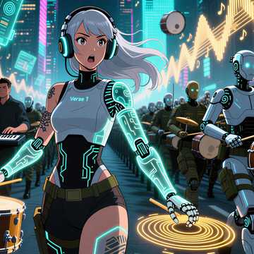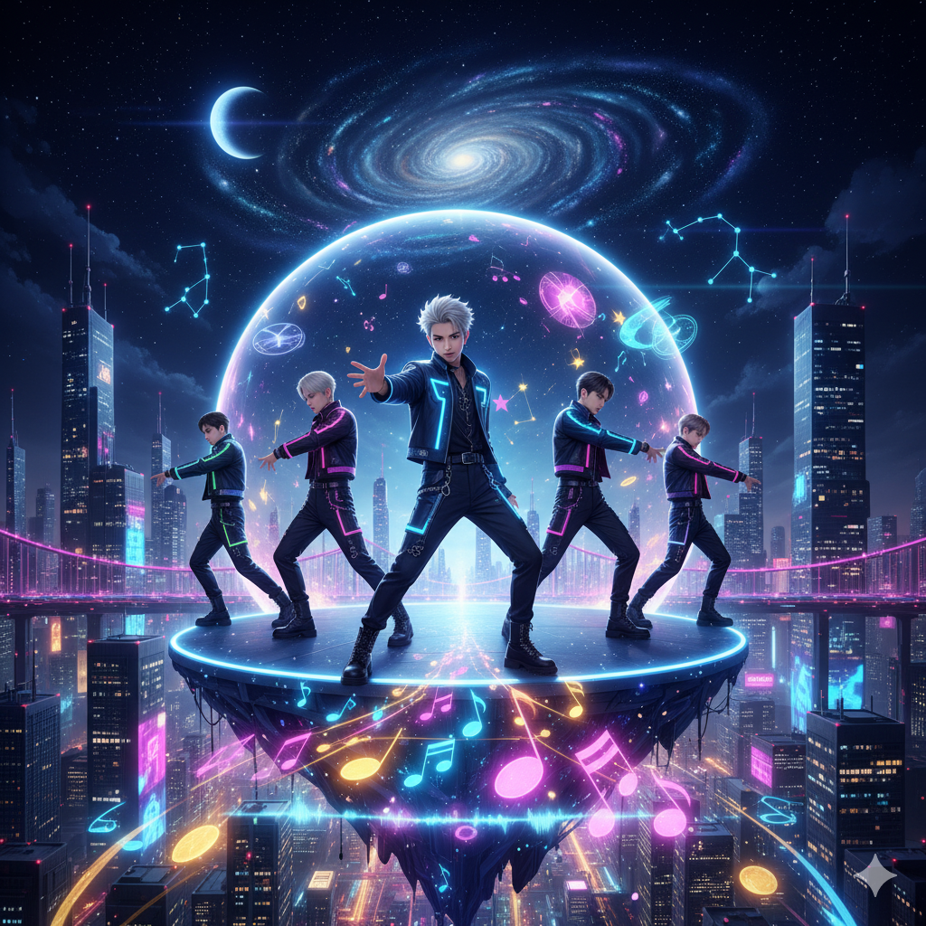A high-energy contemporary Pop-Rock ร Synthwave fusion with a 2020s Oriental-J-Pop flair, radiating a triumphant and inspiring spirit, Driven by rhythmic electric guitars, pulsing synth basslines, and a signature koto hook that bridges modern and traditional soundscapes, Dual male vocals trade verses โ one with a clean, emotive tenor, the other with a gritty, confident tone, blending into soaring harmonies that lift the chorus like a stadium-wide chant, The 145 BPM tempo fuels a feeling of motion and determination, perfectly loop-friendly for endless replay, Production is stadium-scale and cinematic: wide stereo drums with bright snares and sidechain-driven synth pads, shimmering reverb tails, and bold anthemic drops, The mood evokes a night skyline glowing with neon lights โ a celebration of perseverance and unity, like a victory cry echoing across a digital city