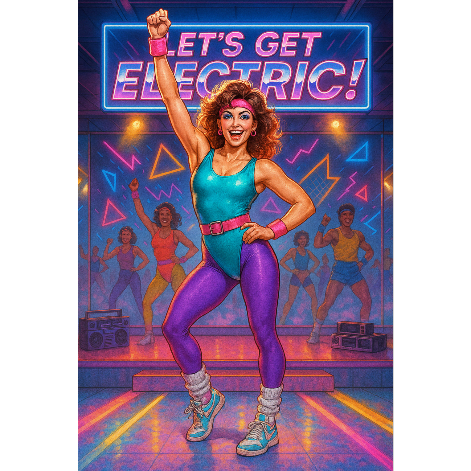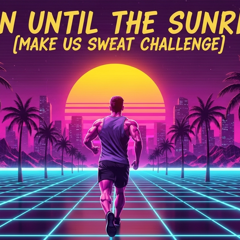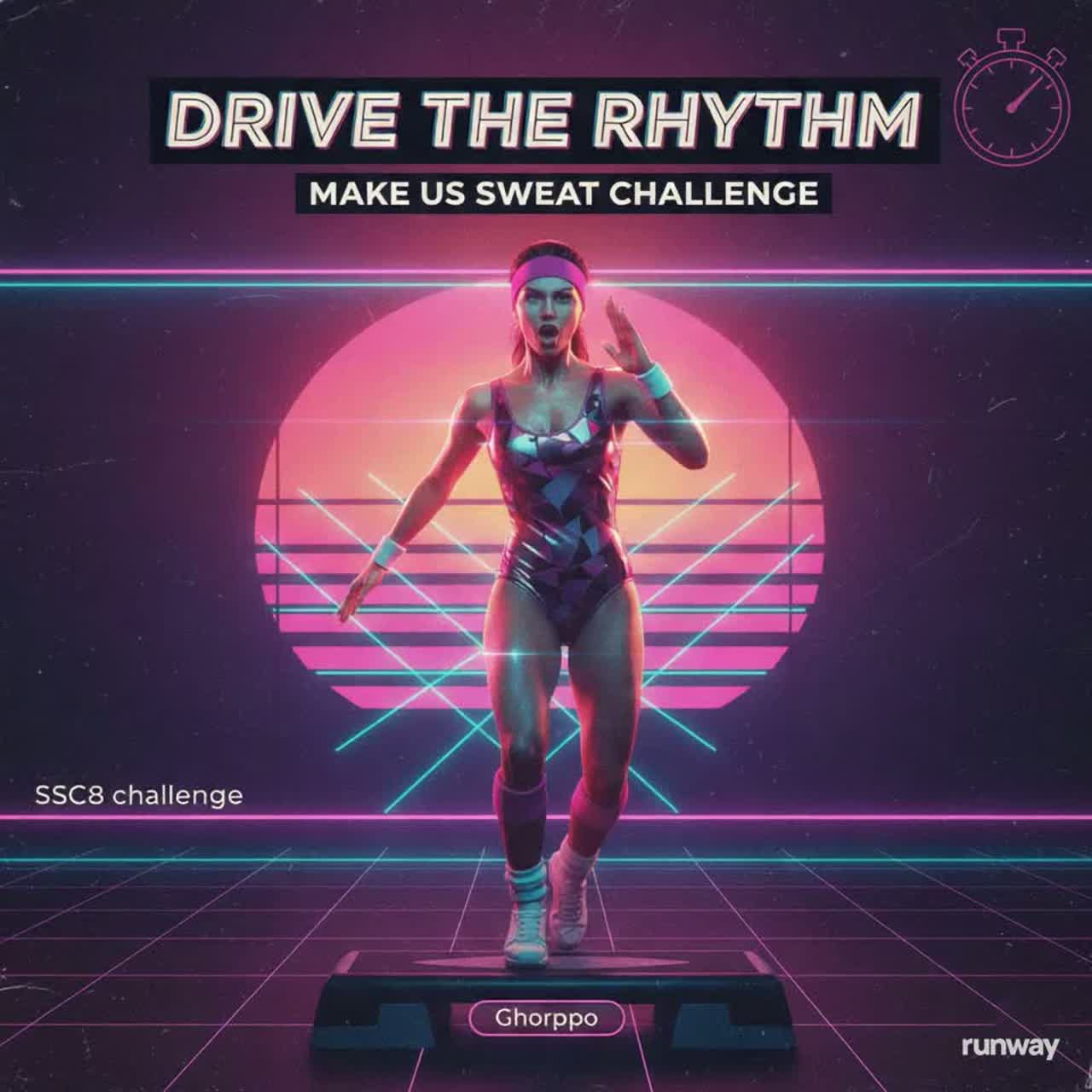 A VHS-glitched Synthwave workout anthem built from retro aerobics samples, slap basslines, analog drum machines, and breathy robotic count-offs, The track should feel like a forgotten 1987 fitness cult tape resurrected from a digital shrine, Think hyper-pumped synths, gospel pads, funky arpeggios, neon handclaps, and vocoded chants layered like religious mantras, Each chorus swells with synthetic devotionโequal parts ridiculous and reverent