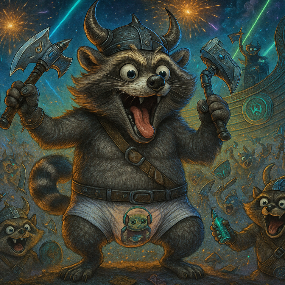 Energetic live concert techno-rave track with comedic Viking battle energy and raccoon-themed hype, Tempo 138–142 BPM, key C minor, Arrangement starts with a crowd hype intro over deep sub-bass and airhorns, transitions into war-drum-inspired techno beat layered with distorted bass growls, Big EDM-style drops in each chorus with aggressive sidechain compression, glitchy raccoon chitter samples, and rave sirens, Vocals are shouted, half-sung, and call-and-response with an imaginary crowd, Sound design includes comical breakbeat sections, pitch-shifted raccoon voices, heavy kick drum, distorted synth stabs, and abrupt beat cuts for comedic timing, Lighting effects implied through audio stingers and crowd reactions, Overall mood: chaotic, absurd, high-energy, perfect for a festival mosh pit where half the people are in Viking helmets and no pants