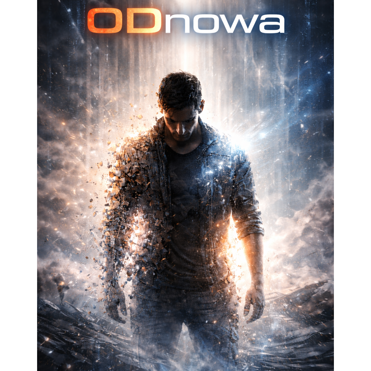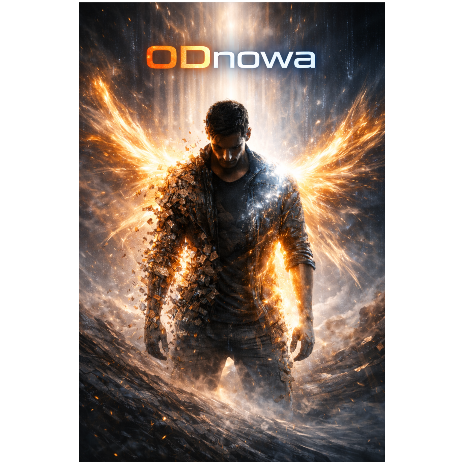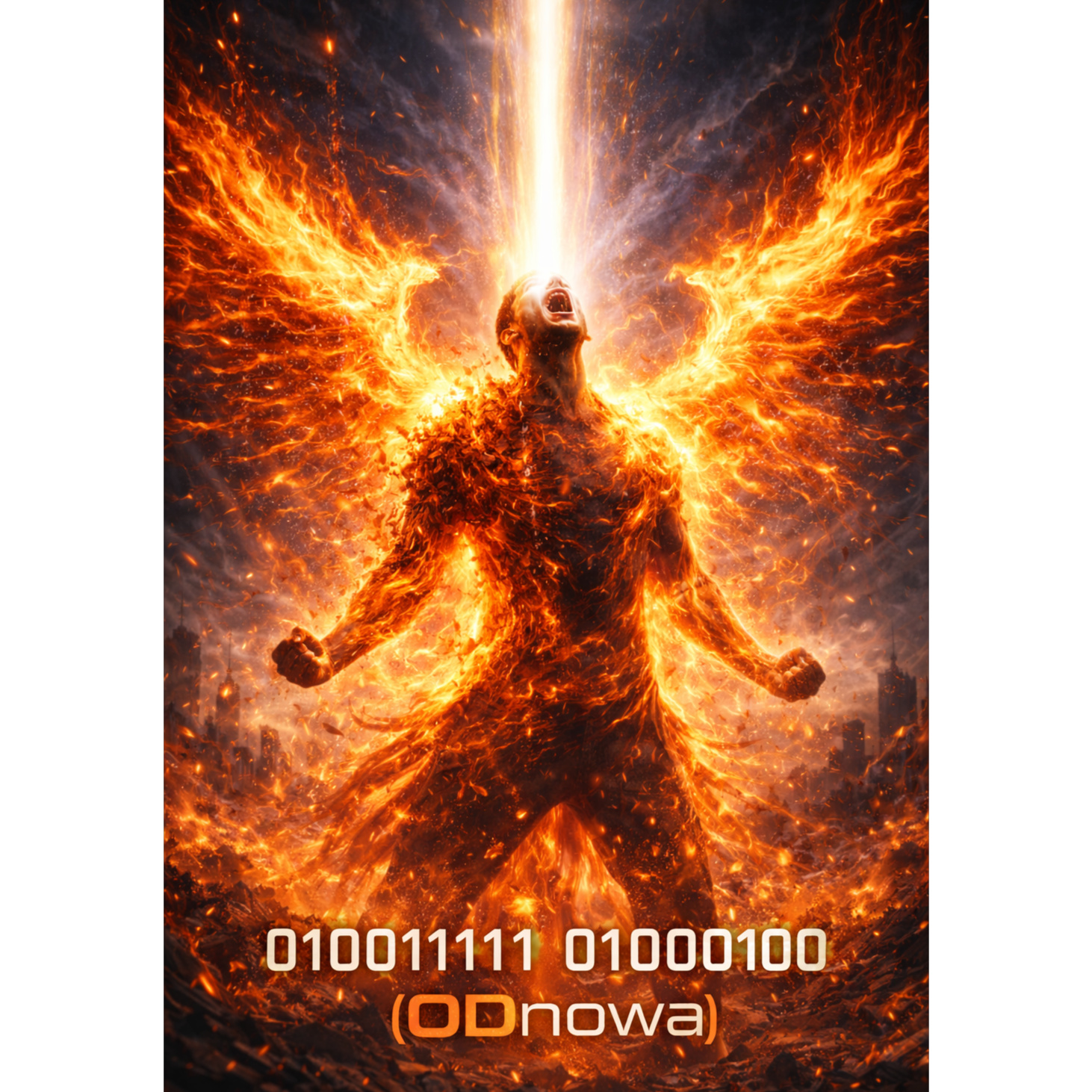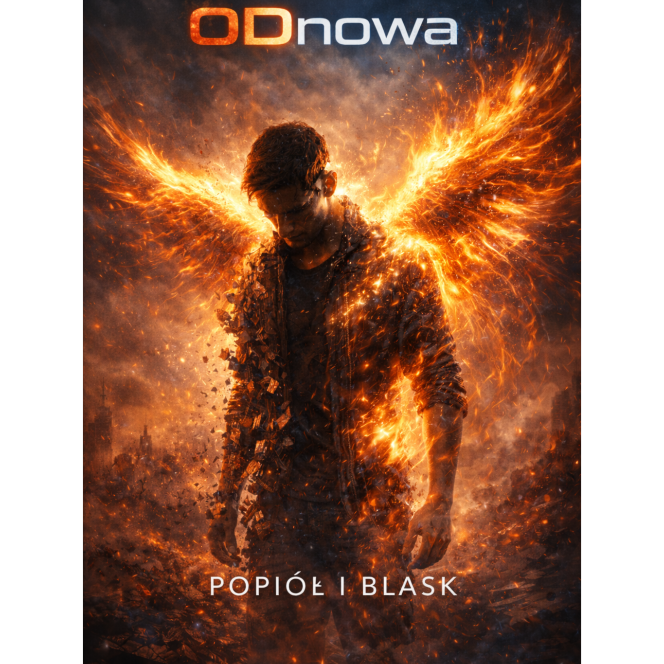 epic cinematic rock hybrid; massive, dark-heroic sound blending hybrid orchestra, thunderous taiko and tribal percussion with syncopated rhythm, modern electronic textures, and deep cinematic sub-bass; solo piano in intro and bridges providing emotional tension and narrative depth; hybrid synths wide and evolving, layered with ethereal pads, orchestral brass, strings, and glitch FX; electric guitars ambient and atmospheric in verses, in choruses wide and filmically textured but lightly distorted, supporting the orchestral layers without overpowering; choirs and harmonic vocals rising like an army call, accentuating emotional climaxes; male vocal low, tense, and resolute in verses, open, commanding, and heroic in choruses; arrangement dynamic, cinematic, and evolving from quiet tension through defiance to radiant heroic resurgence; mood - awakening, power, triumph, and rebirth through fire and determination