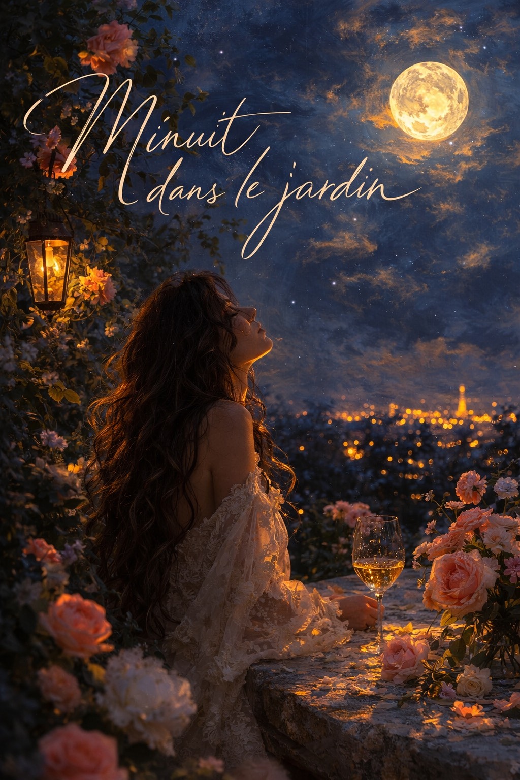 Dreamy French indie pop with soft vintage light and nocturnal intimacy, Mid-slow tempo 92–96 BPM, gentle but present brushed-drum groove, light rhythmic pulse from the start, Warm electric piano, clean guitar arpeggios, subtle analog pads, round minimal bass, spacious breathing dynamics, Atmosphere blending rose-garden afternoon freedom with cinematic late-night city tenderness, Female vocal airy, intimate, softly grounded, emotional yet controlled, Mood tender, elegant, quietly passionate, Theme intimacy, slow time, gentle temptation, temperance, freedom without performance