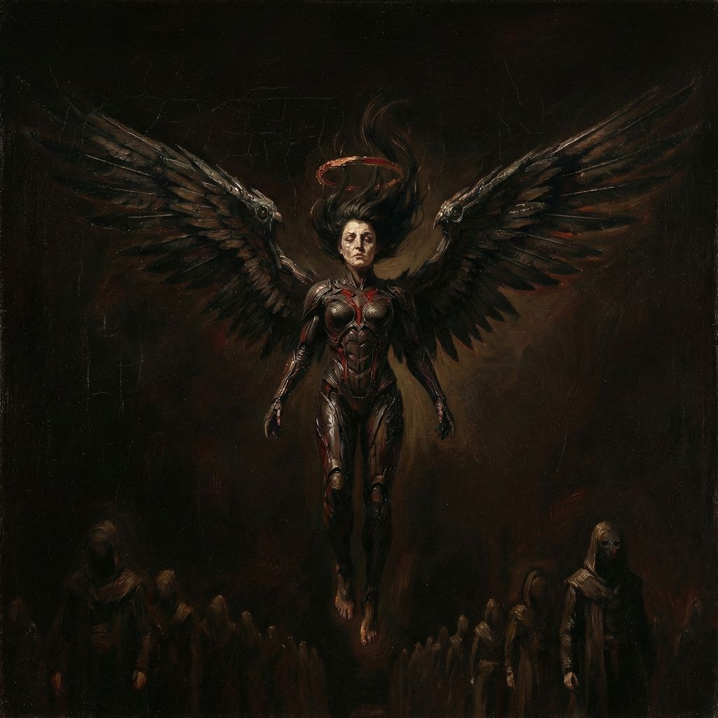 Theophanic Industrial, Liturgical Machine Music, 50 BPM feel, slow inevitable pacing, massive spectral density, sub-bass pressure floor, bit-crushed analogue drone, rusted clockwork percussion, monastic male cantorial chant, Enochian and Hebrew liturgical fragments, assigned vocal delivery, no vibrato, minimal melody, stepwise motion, iron-oxide tonal palette, high-frequency diagnostic flare, blinding overload climax, mythic dark ambient, industrial ritual, ‑catharsis, ‑groove, ‑heroism