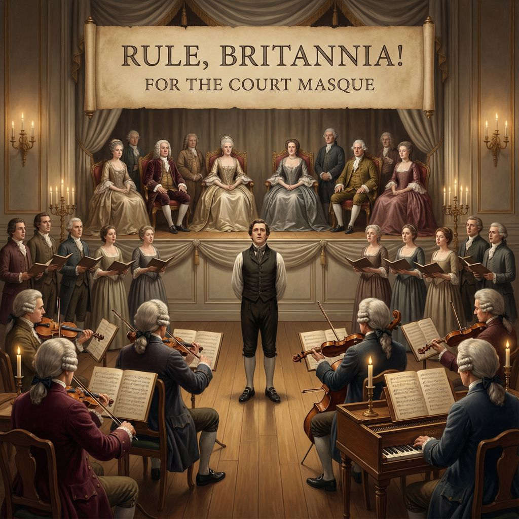 British ceremonial ode, 18th century court masque style, English coronation anthem, restrained tempo, dignified processional pace, British male lead vocal with clear received pronunciation accent, SATB mixed choir with British choral diction, minimal vibrato, orchestral strings, natural trumpets and horns, timpani used sparingly, harpsichord continuo, oboes and bassoons for color, no guitars, no drum kit, no modern percussion, noble and measured dynamics, formal articulation, cathedral and court hall acoustics, wide but natural stereo, historical gravitas, authoritative not aggressive