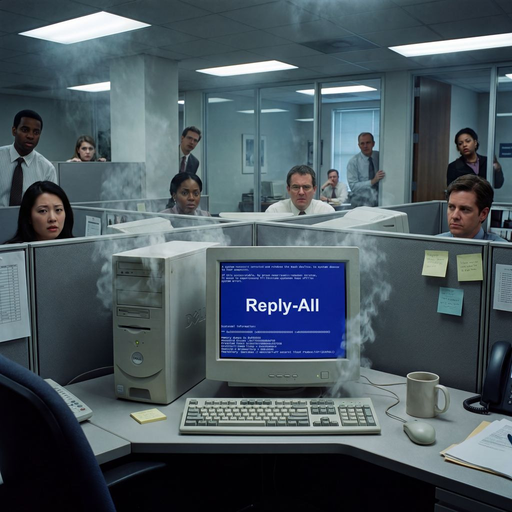 Mid-tempo acoustic office-swing, 118–128 BPM, vocal-centric satirical ensemble, conversational storytelling tone, increasingly frustrated escalation, polished but human, witty not frantic at first, then controlled corporate panic