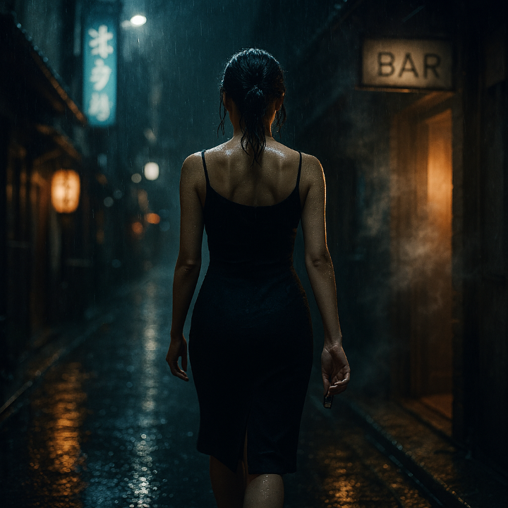 Prompt: A smoky bar at midnight, A man drinks Laphroaig, lost in thought, The sound of ice breaks the silence, A woman enters, her wet hair carrying the scent of night, The bartender nods and moves quietly, Tanqueray is lifted, lime lingers, The shaker blends with jazz, tension builds, She drinks a Gimlet in one breath — like ending something, Silence follows, Words weigh more than life in this city, Jazz quickens — something begins
