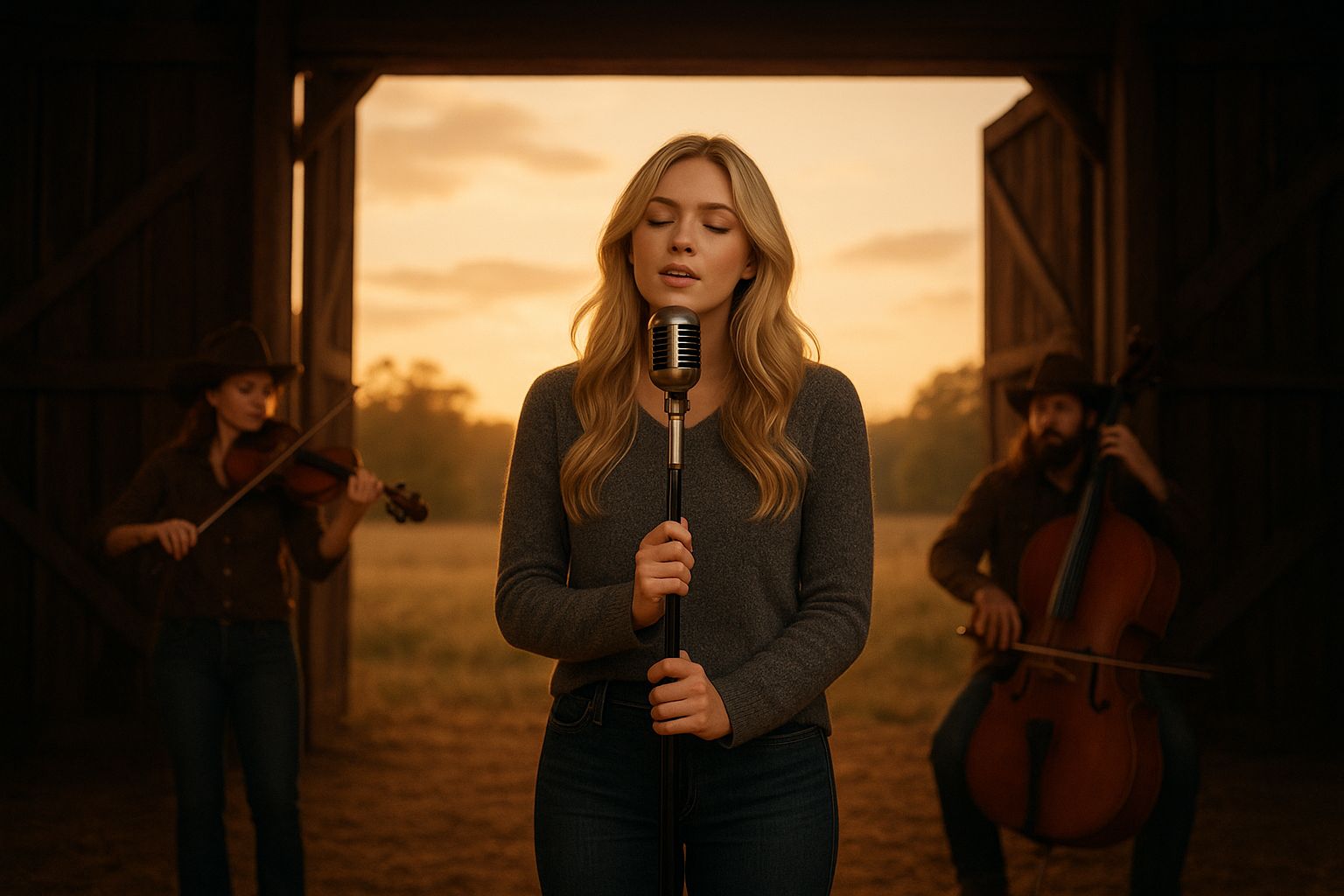 A country track opens with fingerpicked acoustic guitar and subtle steel guitar accents, Warm bass and brushed drums establish a laid-back groove, Each verse grows with gentle fiddle and layered harmonies, leading to a chorus highlighted by soaring male vocals and bright electric flourishes
