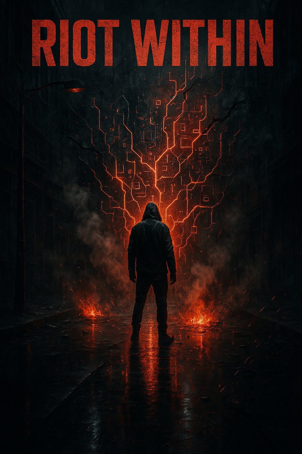 A dark, aggressive electro-industrial sound inspired by modern talk-driven synth elements fused with Neue Deutsche Härte influences, Drums should be heavy and mechanical, with deep kick impacts, sharp metallic snares and percussive patterns that feel industrial and relentless, Synths must be thick, distorted and layered, using gritty bass pulses, harsh arpeggios and atmospheric pads to create a tense urban environment, Add NDH-style guitar layers: low-tuned, rhythmic, percussive and saturated, supporting the electronic backbone with extra weight, Vocals should have a cold, commanding presence with spoken or half-sung phrases in the verses and a more powerful melodic delivery in the chorus, Include processed backing shouts for intensity, The Extended Solo should be long, industrial and rising, blending distorted synth leads with metallic guitar accents, Maintain consistent loudness with no end-volume increase
