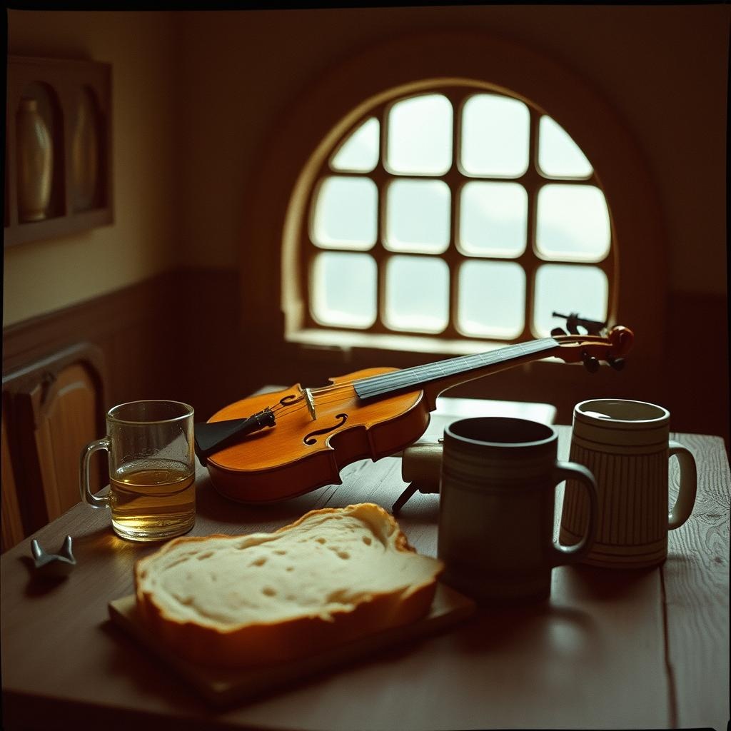 A mournful Irish folk tune opens with plaintive fiddle, accompanied by lute arpeggios, Sparse percussion—soft frame drum, muted bodhrán—enters as the lute and fiddle intertwine melodies, Modal harmonies evoke medieval tavern warmth, finishing with a slow, somber instrumental fade